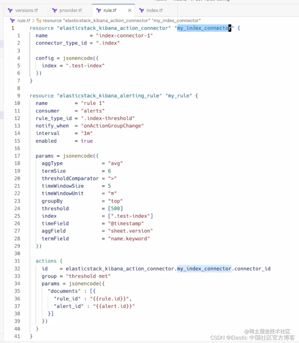 Terraform Elastic Stack 提供程序发布了一项新功能,允许用户在 Kibana 中管理其警报规则和连接器。 这使用户能够自动化手动流程,从一个位置管理多个集群,并解锁更多用例,例如版本控制。