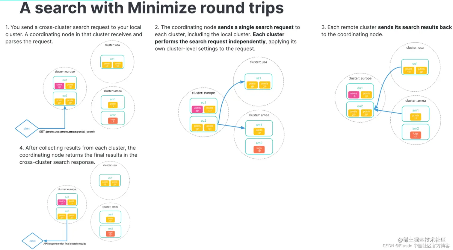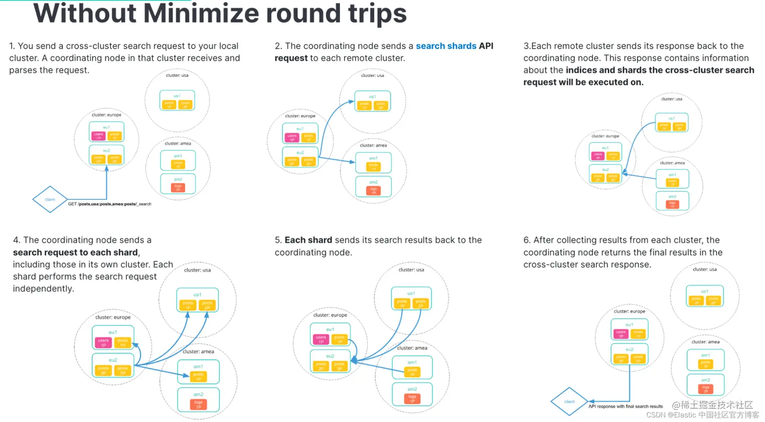 作为一个分布式系统,Elasticsearch 会受到网络延迟的影响。 这种情况在跨集群设置中会被放大,其中搜索必须通过网络展开到多个集群以及这些集群内的节点。 网络行程越多,网络延迟对性能的影响就越大。 传统上,如果不使用我们称为 “最小化往返” 的选项,跨集群搜索就会涉及大量网络行程。