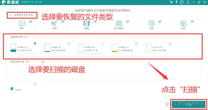 步骤2:此时您可以对需要扫描的文件类型进行选择(如果您想对磁盘做深入的扫描,建议您选择所有文件类型),同时也需要对要进行扫描的磁盘进行选择,点击 【扫描】 ;