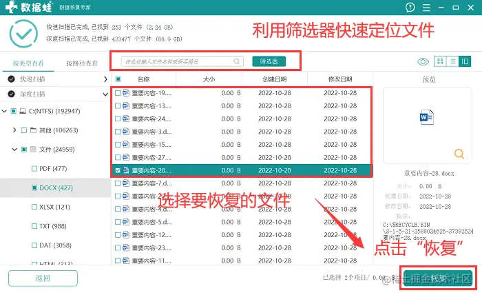 步骤4:在深度扫描结束后,可以再次对需要恢复的文件进行选择,核对文件的相关信息后,点击 【恢复】 ,同时需要选择将文件保存在与原保存位置不同的位置中。