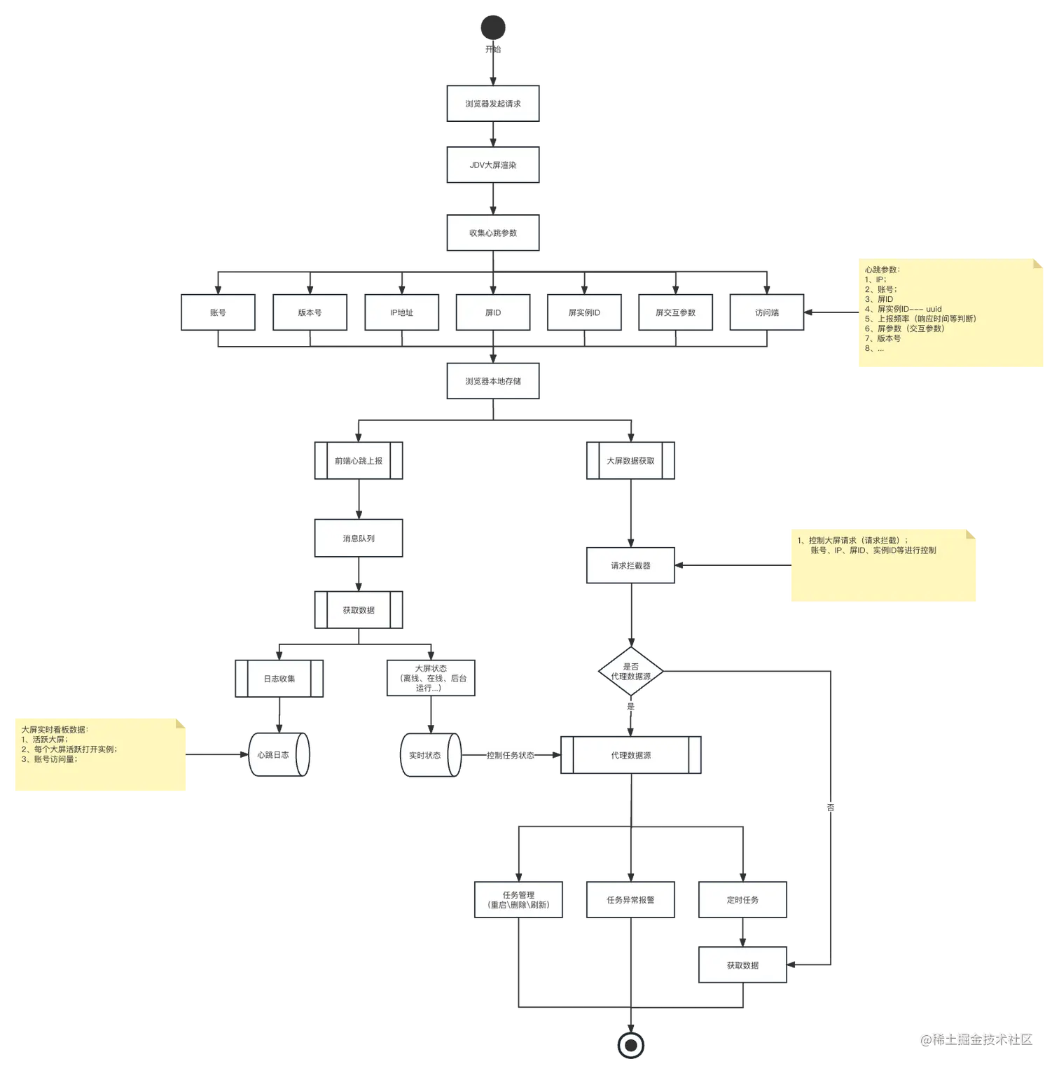 方案:基于以上大屏使用场景,对大屏渲染实例的实时监控将是非常非常重要功能,为了方便我们基于大屏实时监控进行异常预案决策,在本次618大促前我们已增加了大屏实时监控能力,该功能也被我们团队内部认为是监控能力细化的升级版。具体方案流程如“心跳上报流程”图所示,对实例监控的思路主要是基于socket长连接心跳机制(它像心跳一样每隔固定时间发送一次,以此来告诉服务器当前客户端还活着)的借鉴,基于socket心跳上报机制和JDV大屏项目的使用场景通过在页面前端收集用户账号、版本号、IP地址、大屏ID编码、大屏实例ID、大屏交互参数、访问端标识等信息,大屏前端组件将相应心跳上报参数统一进行维护,在指定的上报时间后将会进行心跳上报,同时服务端接收到心跳信息后与代理数据源任务进行关联实时维护任务的存活状态。