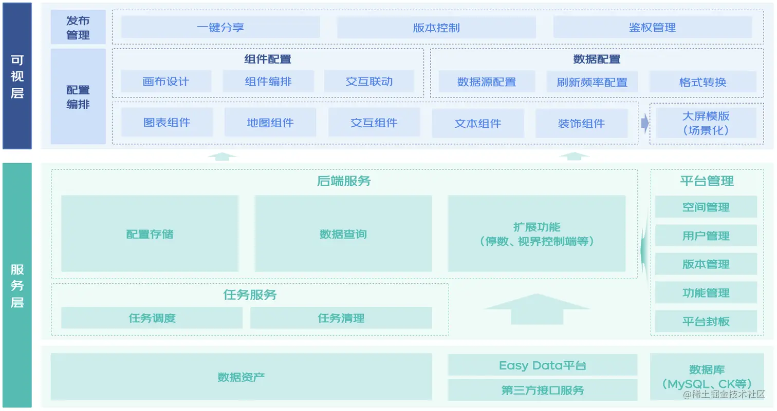 JDV做为可视化大屏搭建平台,平台主要由可视化编排和后端服务组成,由于大屏在页面中渲染后会通过指定刷新频率主动获取数据,每次在页面中渲染后就是一个独立运行实例,系统具体架构如下图所示。