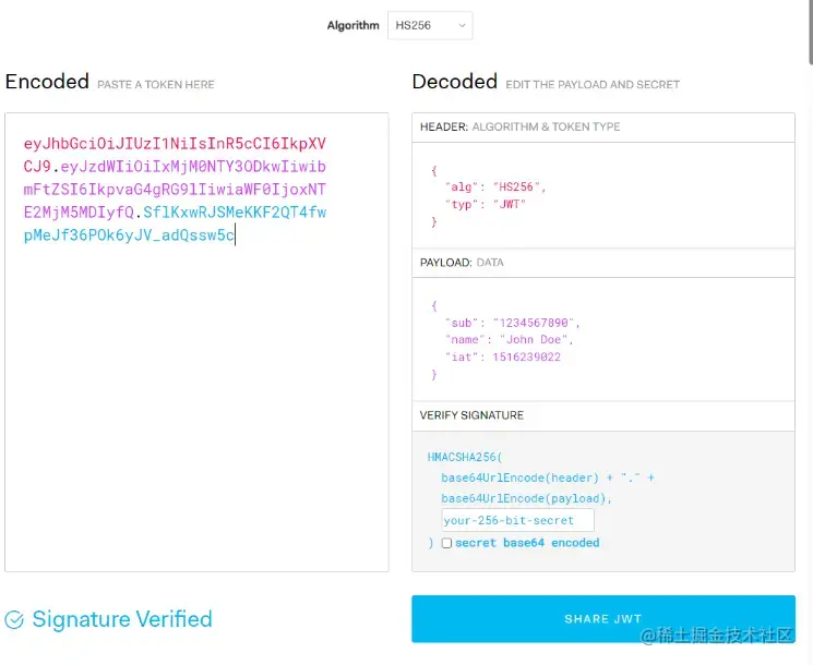 你可以在 jwt.io 这个网站上对其 JWT 进行解码,解码之后得到的就是 Header、Payload、Signature 这三部分。