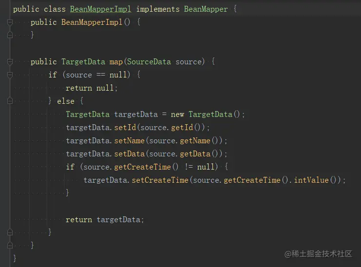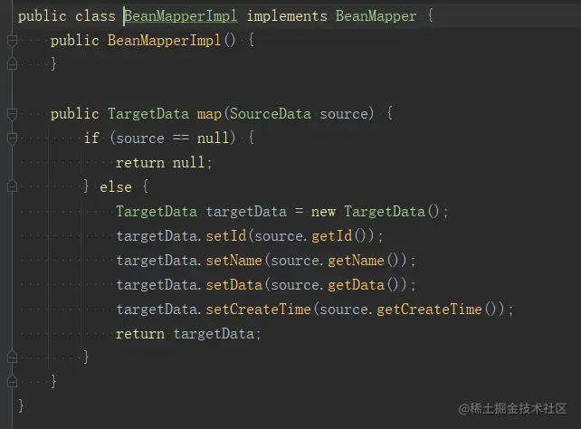 可以看到使用非常简单,默认情况下mapstruct是浅拷贝,所以看到最后一个输出是true。编译后我们可以在target目录下找到帮我们生成的一个接口实现类BeanMapperImpl,如下: