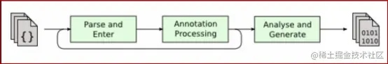 java代码编译和执行的整个过程包含三个主要机制:1.java源码编译机制 2.类加载机制 3.类执行机制。其中java源码编译由3个过程组成:1.分析和输入到符号表 2.注解处理 3.语义分析和生成class文件。如下: