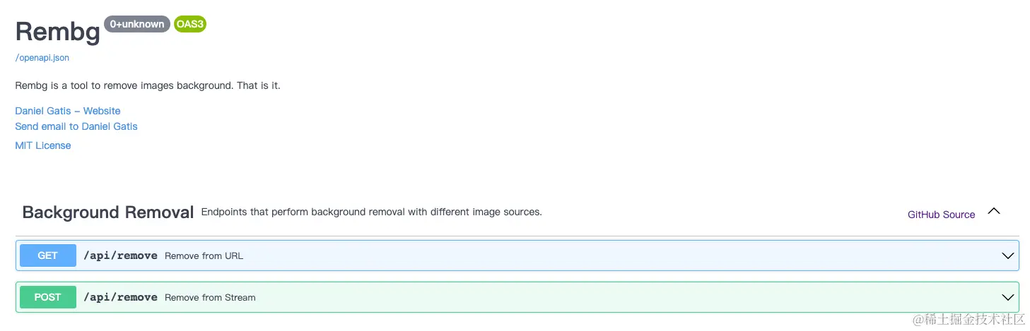 访问 http://(服务器IP):5000/api 就可以看到一个 Swagger 构建的文档,程序提供了两个接口,都是接收一个图像然后返回其去除背景的图像结果,区别在于: