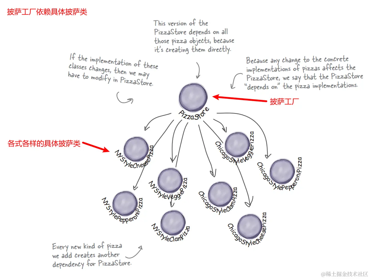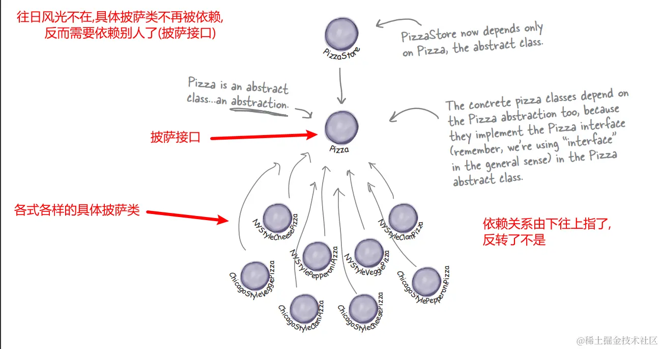 原来的时候,工厂依赖于披萨,披萨变了,工厂就得跟着变,工厂被具体的披萨牵类着鼻子走.