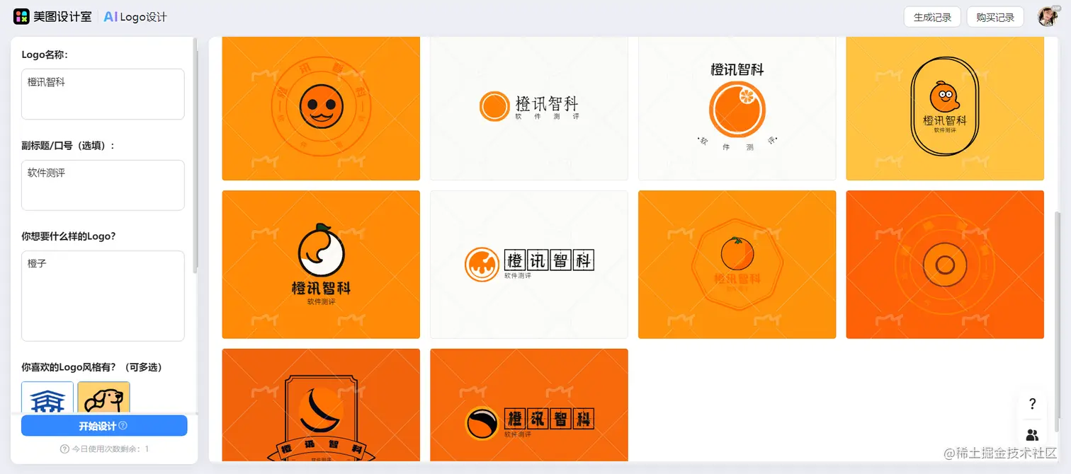 只需要在左边的方框里输入自己logo名称、副标题/口号、灵感以及风格,即可生成属于你的专属logo。