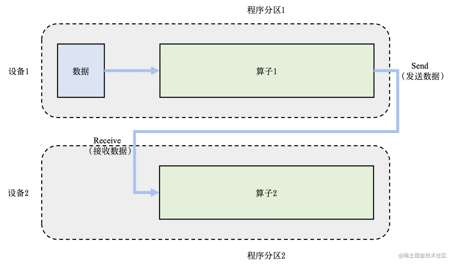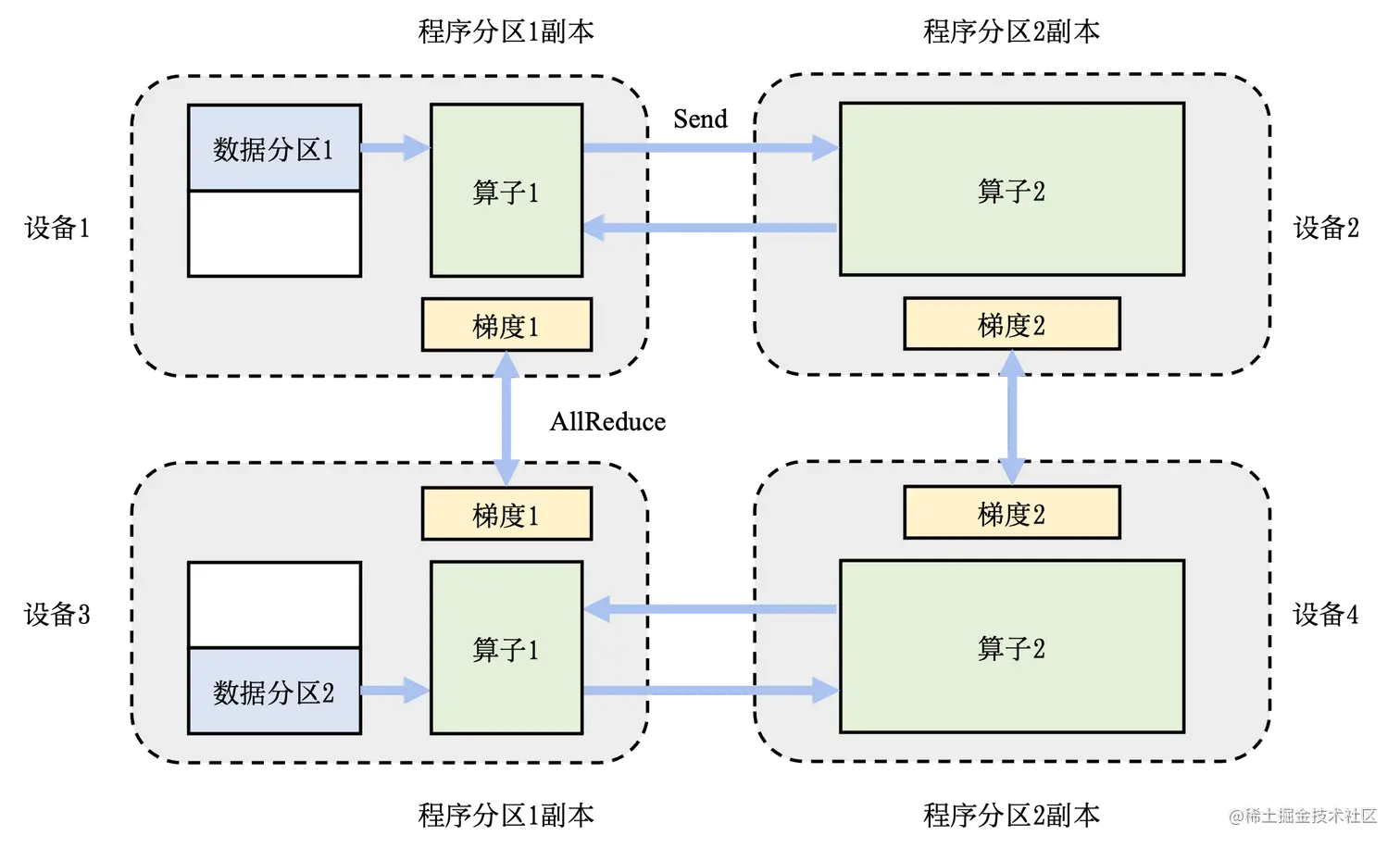 下图就是一个混合并行的例子,数据集被切分到不同的机器上执行,同样的数据集又会被切分到不同的设备上执行不同的计算。这里提供了一个由 4 个设备实现的混合并行的例子。在这个例子中,首先实现算子间并行解决训练程序内存开销过大的问题:该训练程序的算子 1 和算子 2 被分摊到了设备 1 和设备 2 上。进一步,通过数据并行添加设备 3 和设备 4,提升系统算力。为了达到这一点,对训练数据进行分区(数据分区 1 和数据分区 2),并将模型(算子 1 和算子 2,这里不一定是单个算子,可以是对计算图做拆分)分别复制到设备 3 和设备 4。在前向计算的过程中,设备 1 和设备 3 上的算子 1 副本同时开始,计算结果分别发送给设备 2 和设备 4 完成算子 2 副本的计算。在反向计算中,设备 2 和设备 4 同时开始计算梯度,本地梯度通过 AllReduce 操作进行平均。反向计算传递到设备 1 和设备 3 上的算子 1 副本结束。