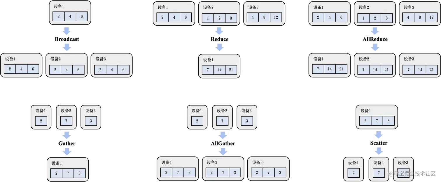 Gather算子可以将全部设备的数据全部收集(Gather)到编号为 i 的设备上(Gather 就是收集的意思)。上图左下部分展示了设备 1 调用 Gather 来收集全部设备的数据的初始和结束状态。