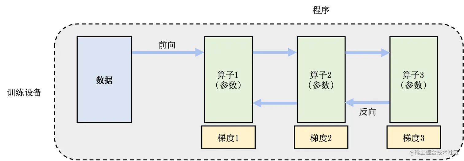 下图是一个单节点训练系统的流程:为了更新参数(模型训练一个 iter 需要更新模型参数),计算图的执行分为前向计算和反向计算两个阶段。前向计算的第一步会将数据读入第一个算子,该算子会根据当前的参数,计算出计算给下一个算子的数据。算子依次重复这个前向计算的过程(执行顺序:算子1,算子2,算子3),直到最后一个算子结束。最后的算子随之马上开始反向计算。反向计算中,每个算子依次计算出梯度(执行顺序:梯度3,梯度2,梯度1),并利用梯度更新本地的参数。反向计算最终在第一个算子结束。反向计算的结束也标志本次数据小批次的结束,系统随之读取下一个数据小批次,继续更新模型。