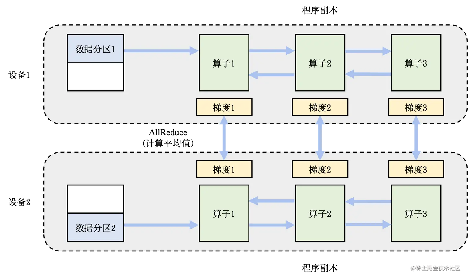 下图展示了两个设备构成的数据并行训练系统(Data Parallel Training System)的例子。假设用户给定的数据批大小是 64,那么每个设备会分配到 32 个训练样本,并且具有相同的神经网络参数(程序副本)。本地的训练样本会依次通过这个程序副本中的算子,完成前向计算和反向计算。在反向计算的过程中,程序副本会生成局部梯度。不同设备上对应的局部梯度(如设备 1 和设备 2 上各自的梯度1)会进行聚合,从而计算平均梯度。这个聚合的过程往往由集合通信的 AllReduce 操作完成(用 cuda 的话一般是通过 NCCL 来完成)。