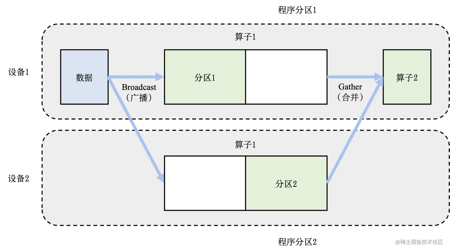 下图是一个模型并行的流程图,同样的一份数据被广播成两份给两个设备分别计算,两个设备的计算并不相同,分别计算出结果之后再 Gather 汇总结果(到主进程)。