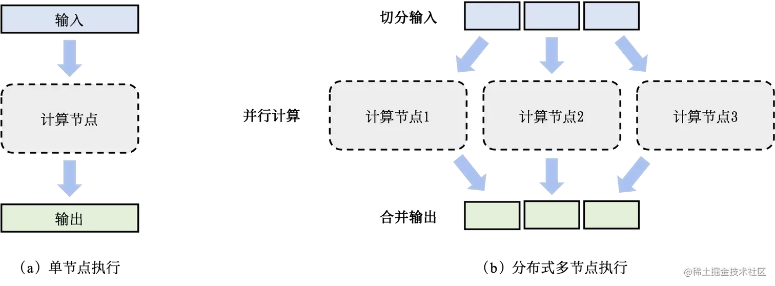相比单节点执行,可以看到分布式训练主要要对输入做一些切分(可能是切分数据集、切分模型参数或者混合的方式)并送到不同的节点进行训练,由于数据或参数的独立性,各节点之间的计算是相对独立的,因此可以并行计算,从而达到加速模型训练的目的。