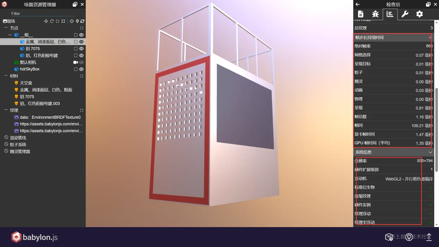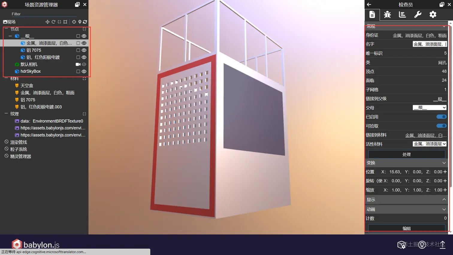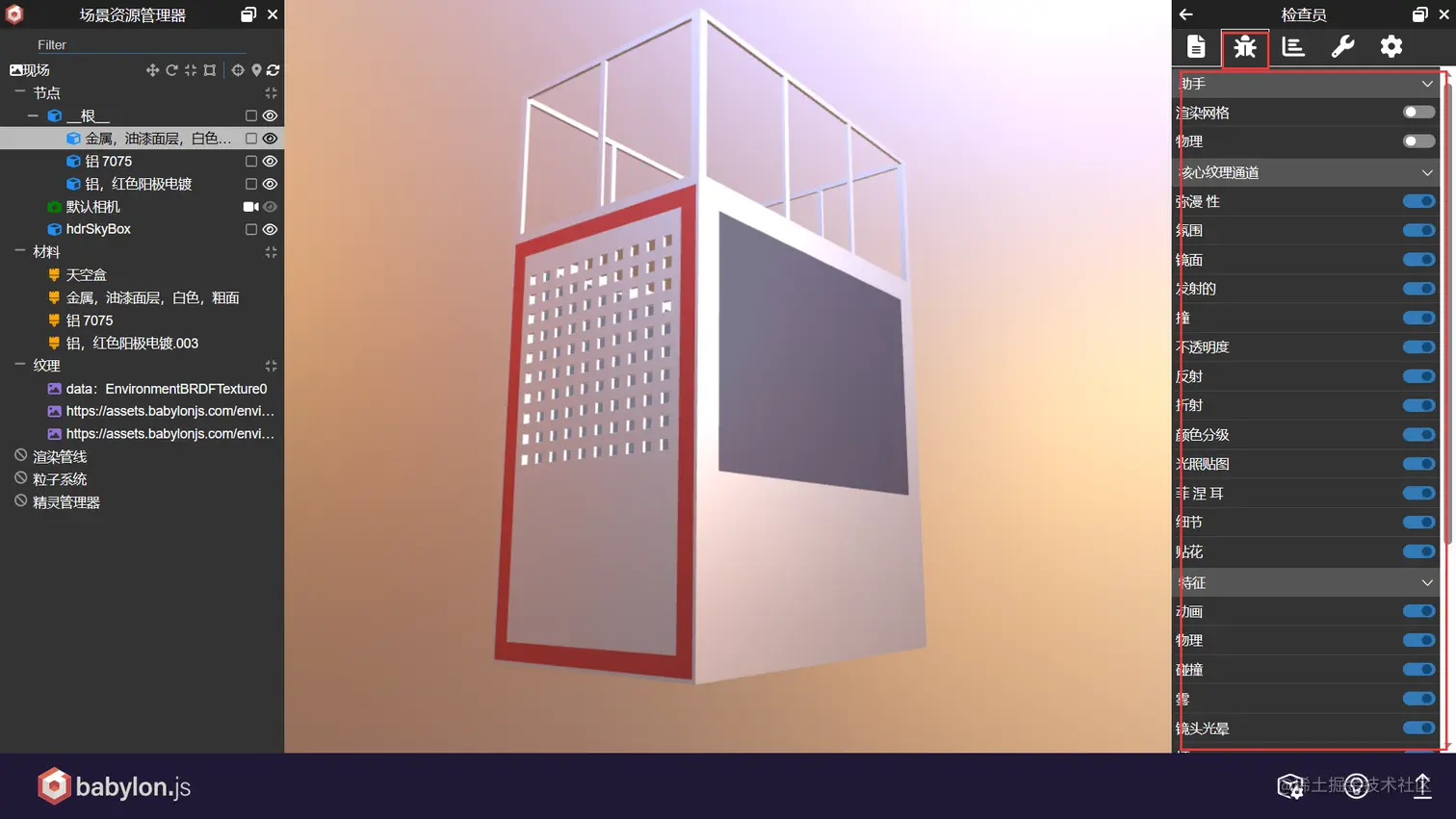 1、创建和编辑场景:Babylon.js Sandbox允许用户在一个交互式的3D环境中创建和编辑glTF场景。您可以添加不同类型的物体、调整其位置、旋转、缩放和属性等,并且可以查看模型子构件的属性信息。