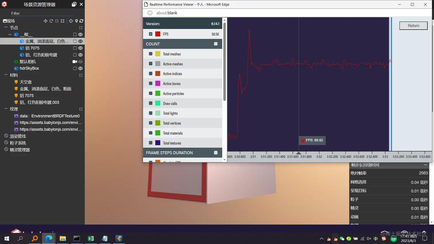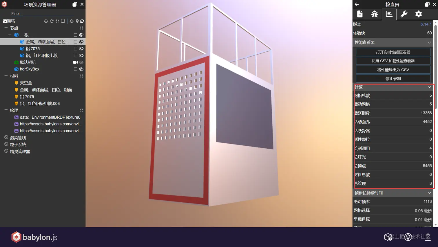 - 性能查看器:实时监控模型渲染性能,并支持将监控数据导出为本地csv文件。
