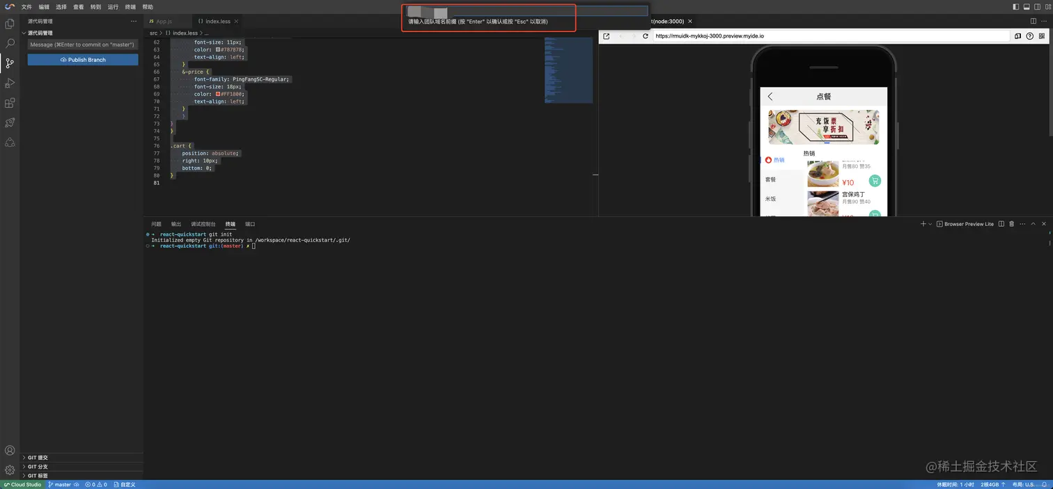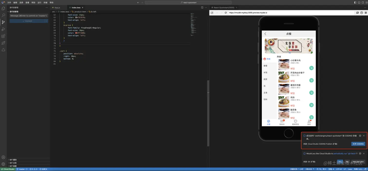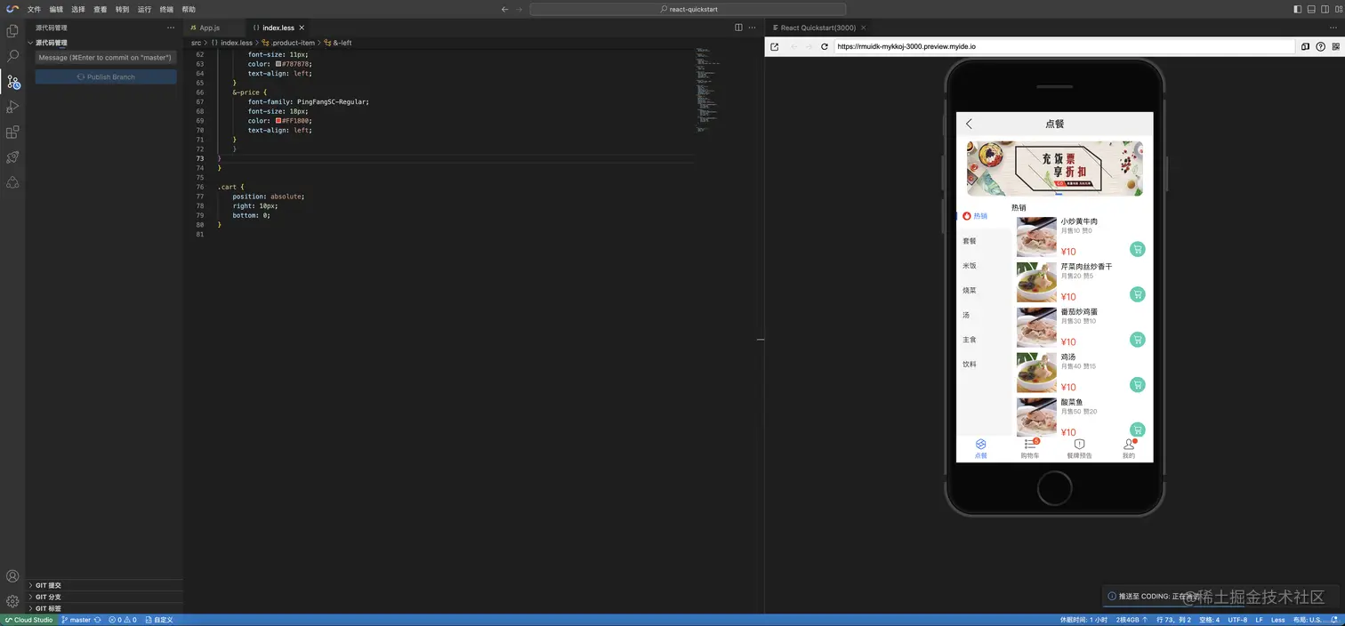 这是一个用 IDE [Cloud Studio](https://www.cloudstudio.net/?utm=csdn) 快速搭建,并开发还原一个移动端 React H5 的简版点餐系统页面,从 0 到 1 体验云 IDE 给我们带来的优势,不需要装各种环境,简单易用,开箱即可上手。