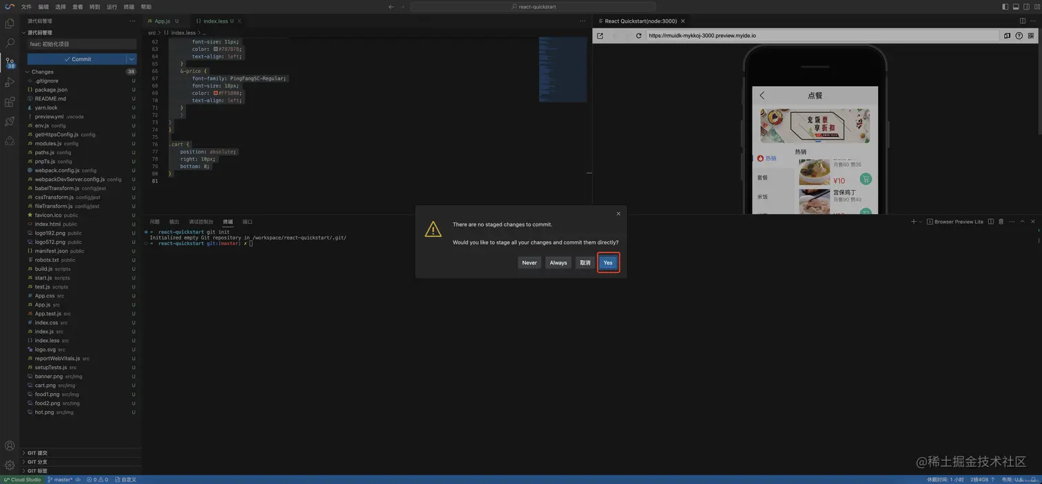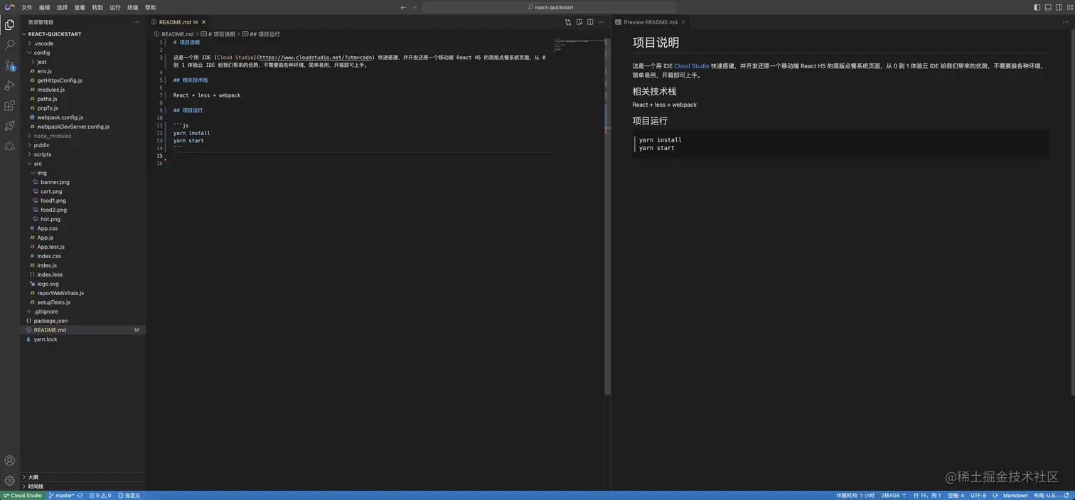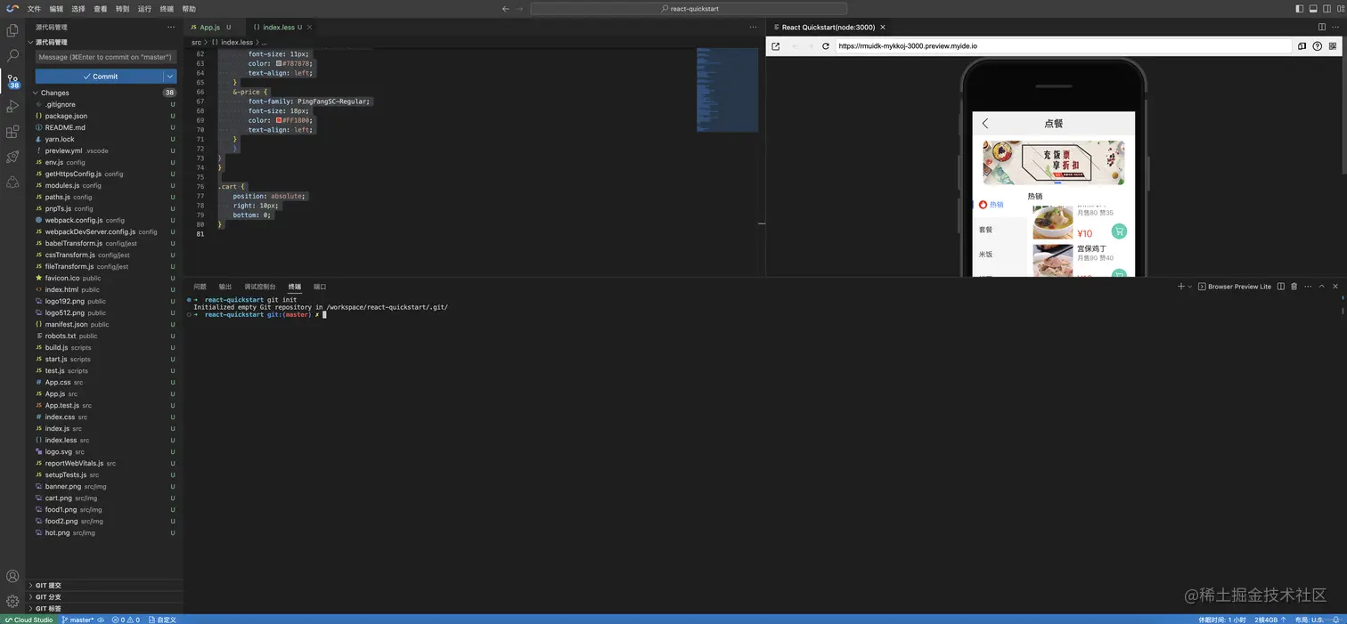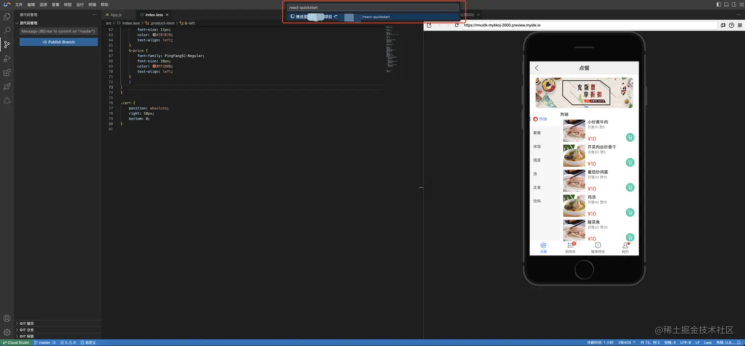 这是一个用 IDE [Cloud Studio](https://www.cloudstudio.net/?utm=csdn) 快速搭建,并开发还原一个移动端 React H5 的简版点餐系统页面,从 0 到 1 体验云 IDE 给我们带来的优势,不需要装各种环境,简单易用,开箱即可上手。