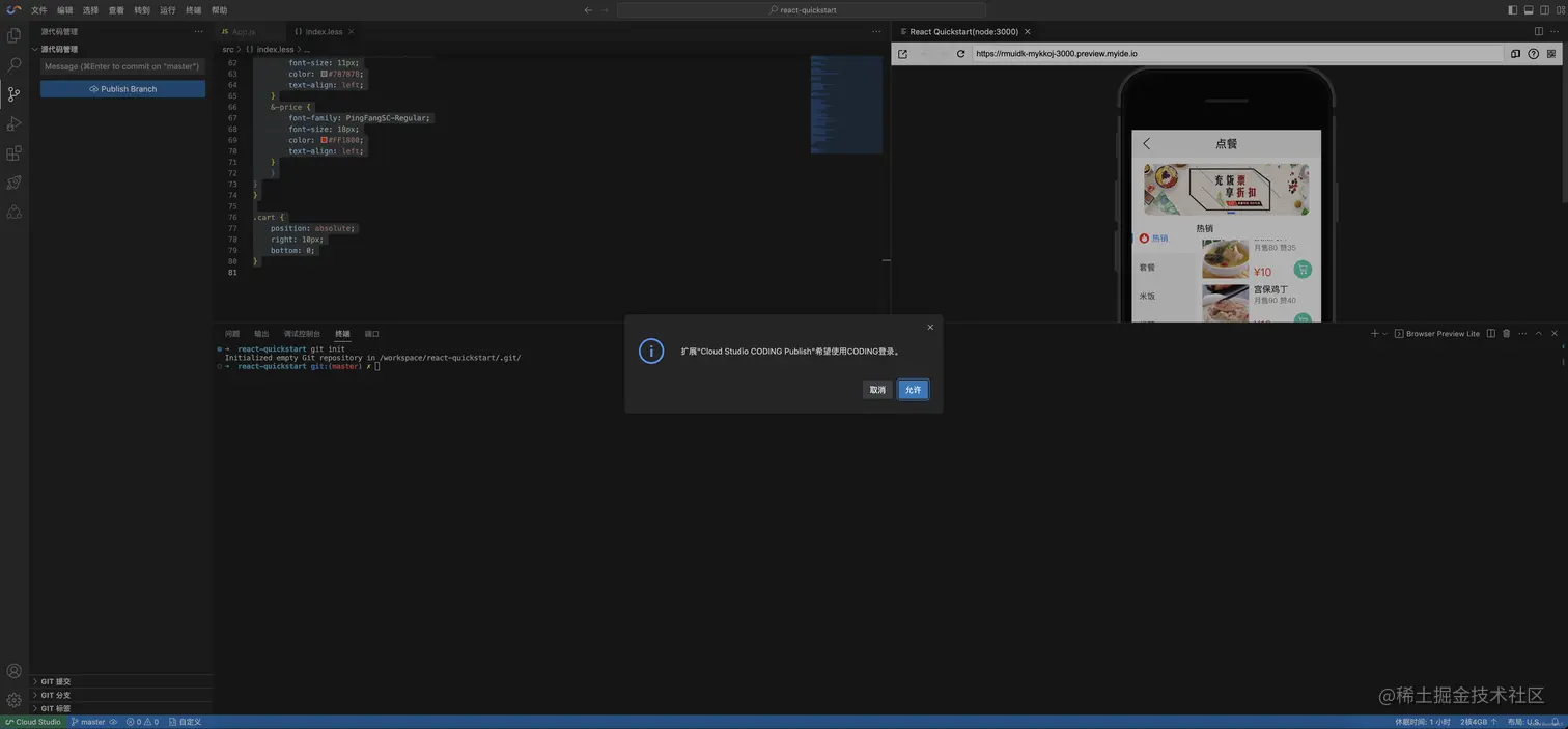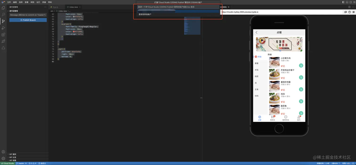 因为代码现在托管到 Coding 上,演示如何发布到 Coding 仓库中,点击"Publish Branch" -> 选择"Publish to CODING"