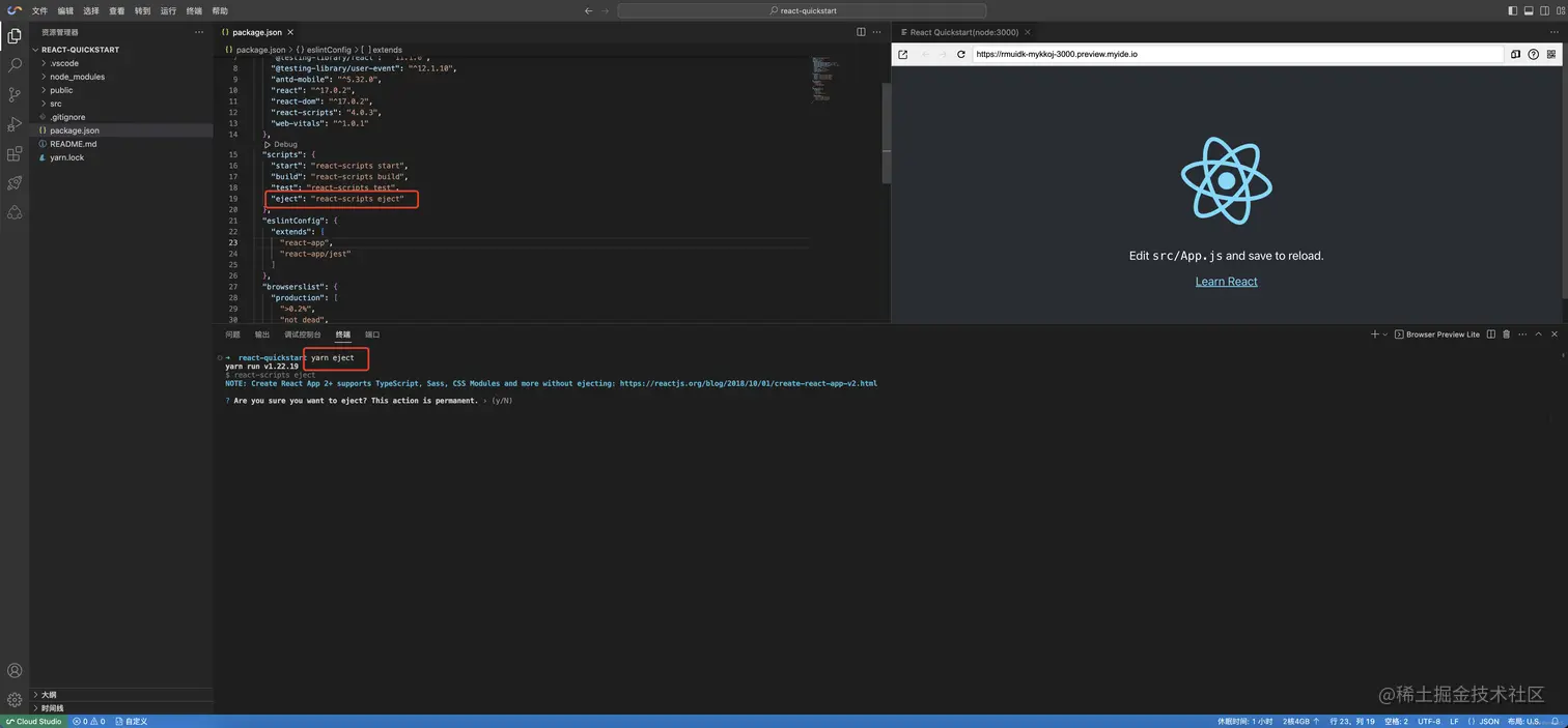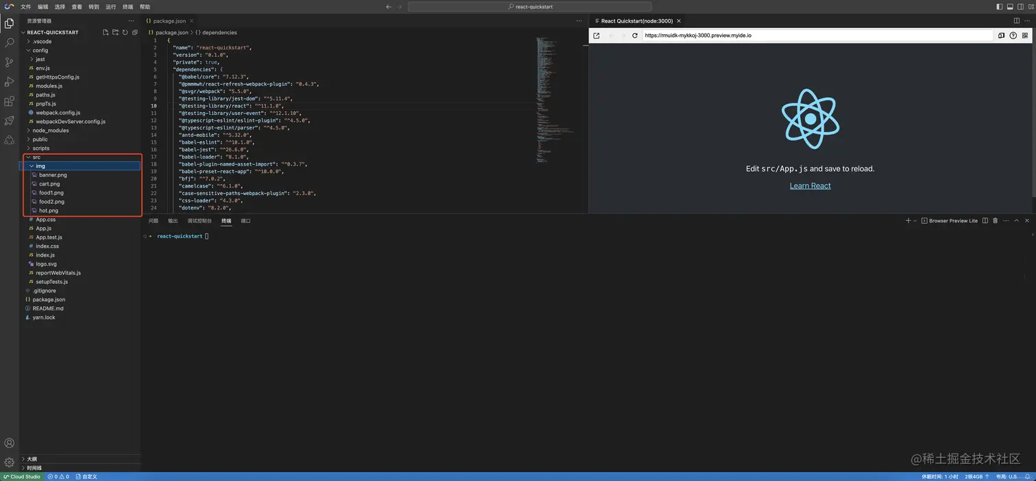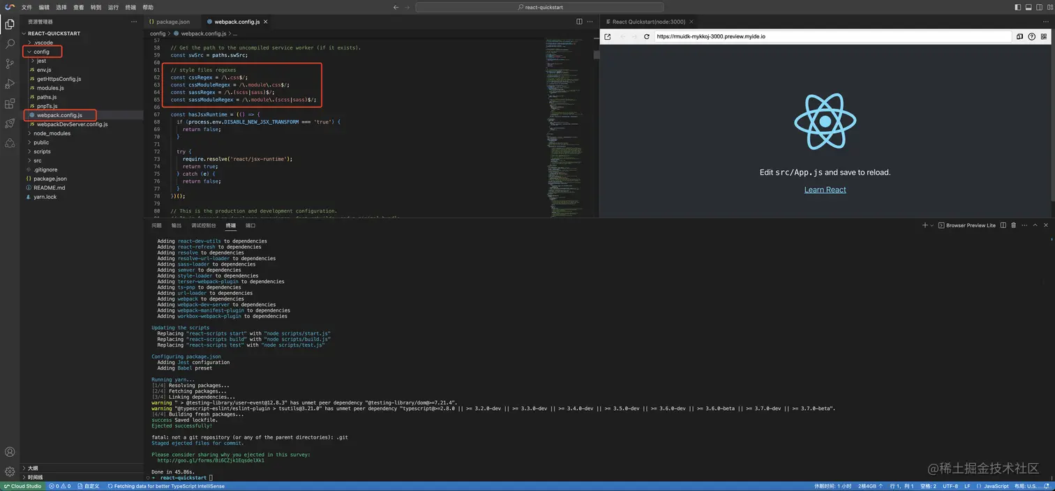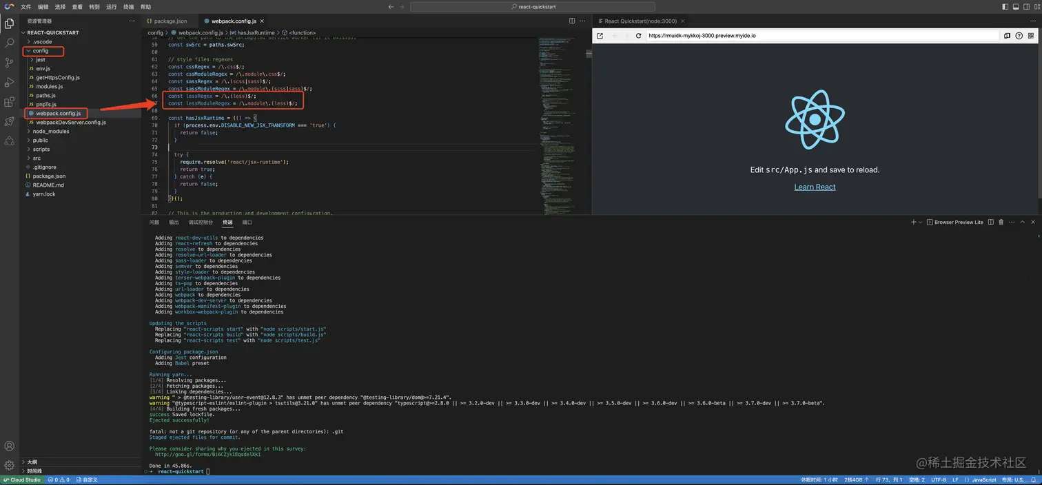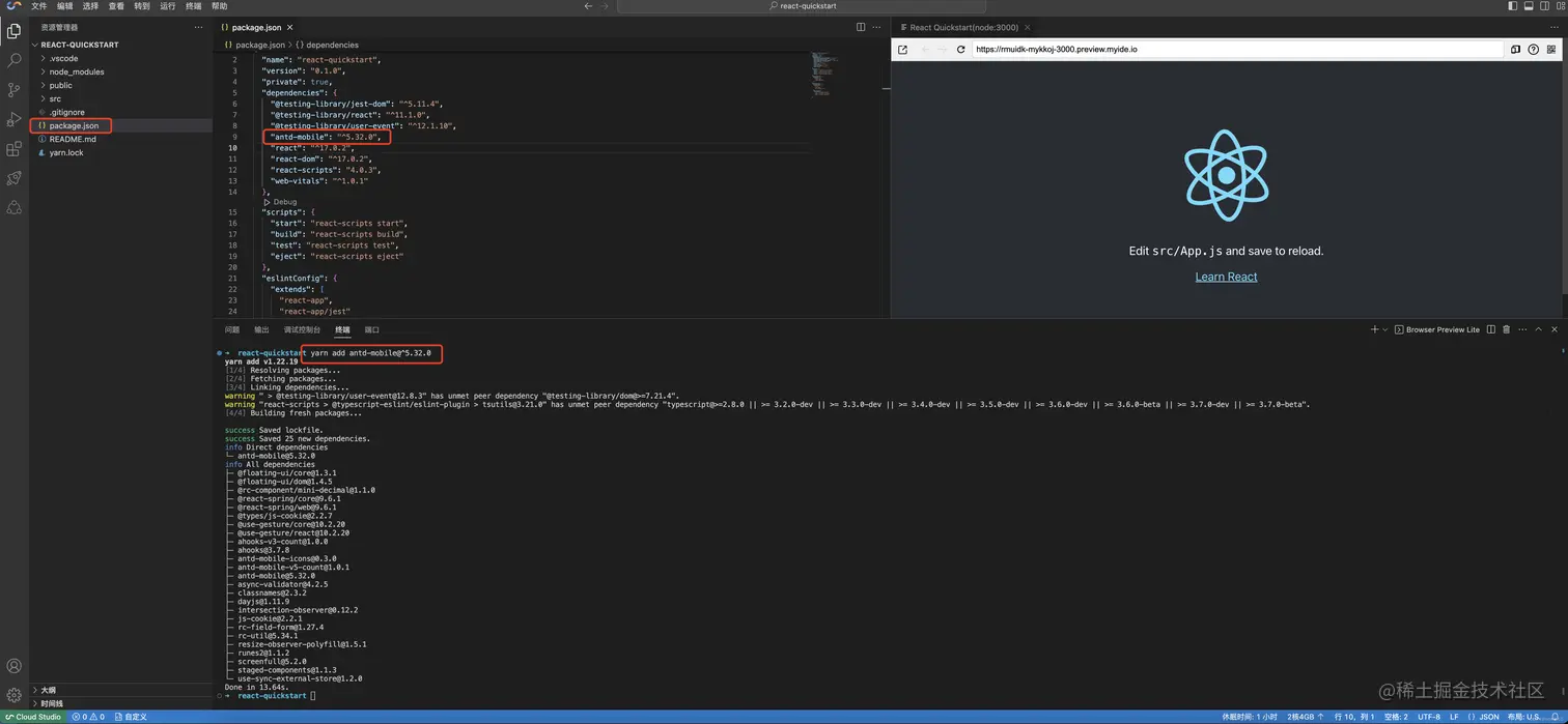 可以看到初始化左侧代码后,控制台会安装依赖及启动一个 React 简单的模板项目。