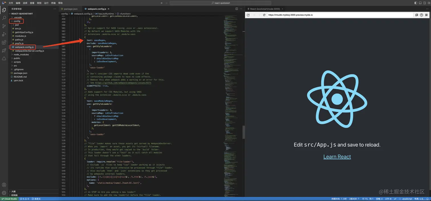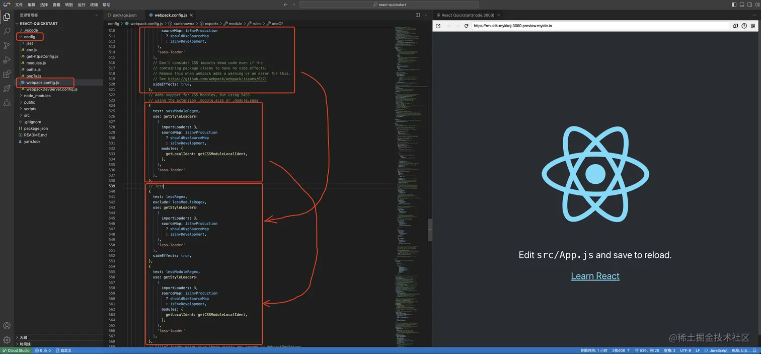 在webpack.config.js中进行配置,这样进行配置需要暴露出React的config配置文件,警告:该操作不可逆