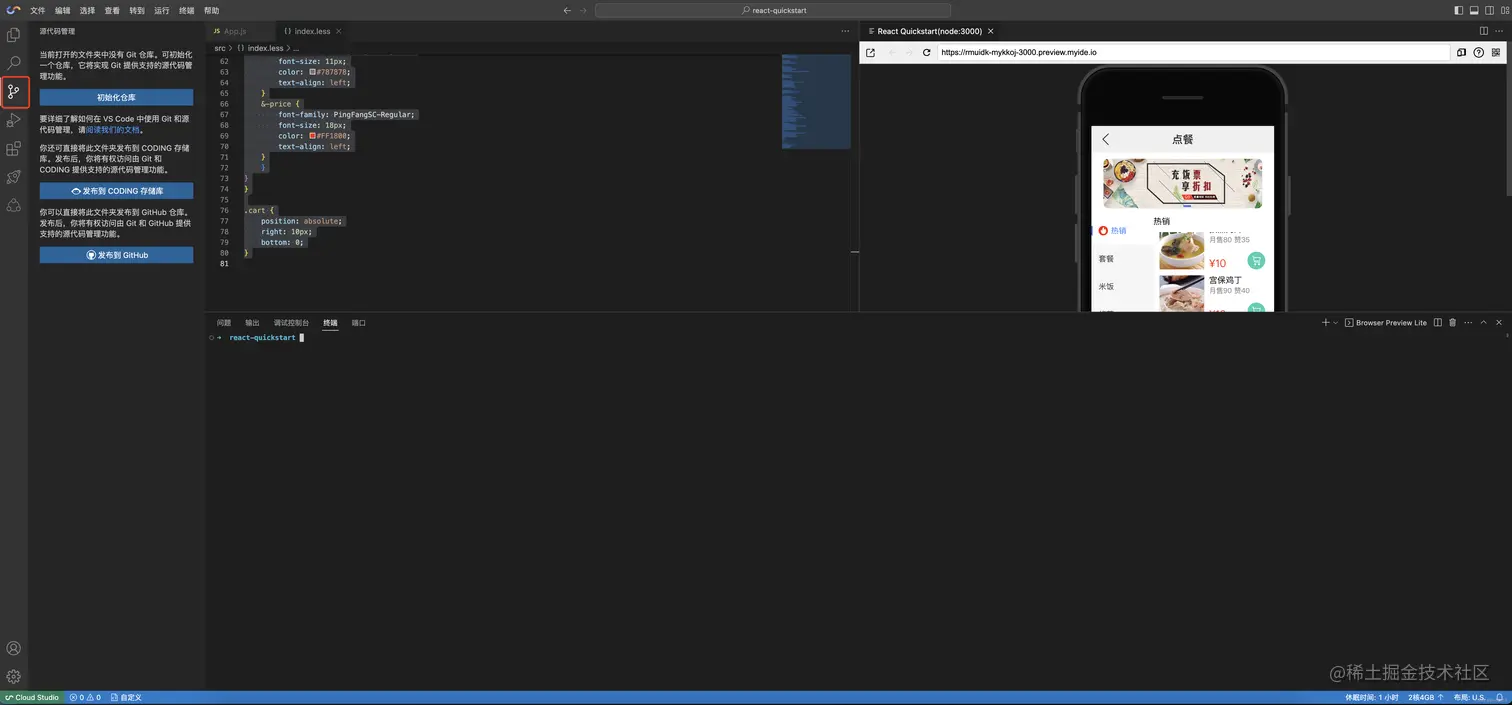 我们经常会遇到远程办公的场景,下面我们打算用云 IDE Cloud Studio 快速搭建,并开发还原一个移动端 React H5 的简版点餐系统页面,从 0 到 1 体验云 IDE 给我们带来的优势,不需要装各种环境,简单易用,开箱即可上手。