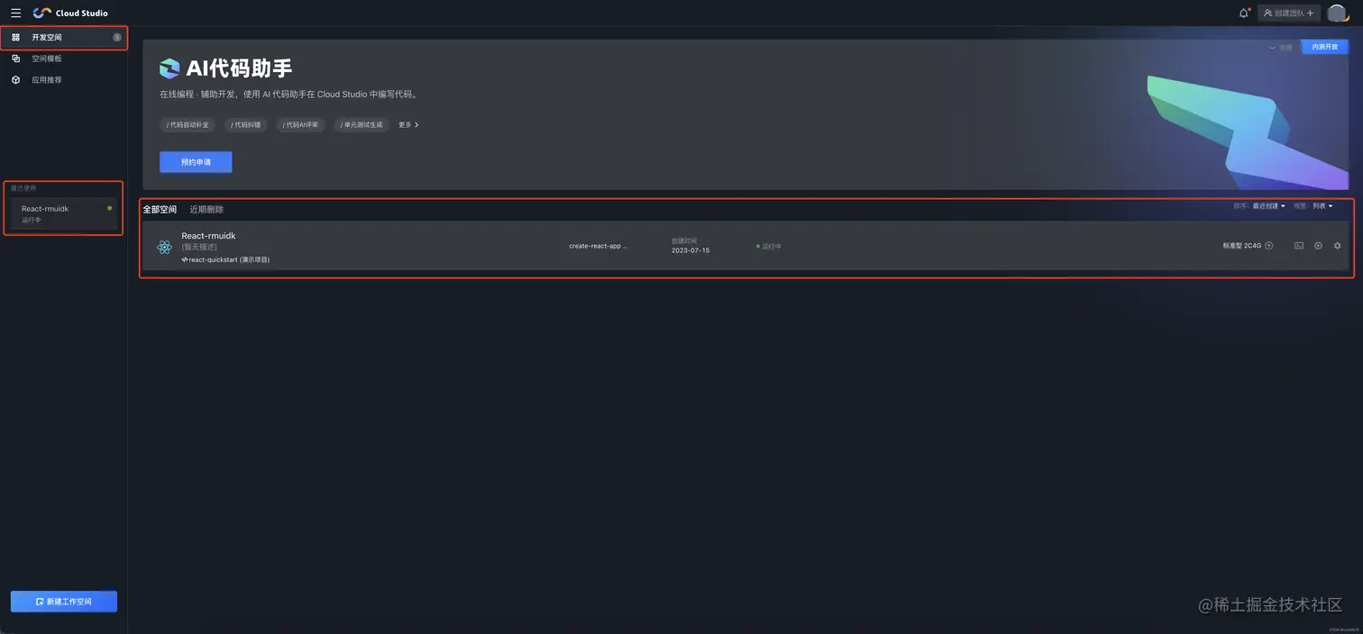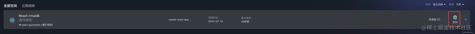 查看正在使用的开发空间,可以看到我们使用的模板是基于 create-react-app脚手架创建的模板,还可以在“近期删除”的空间,进行回滚。
