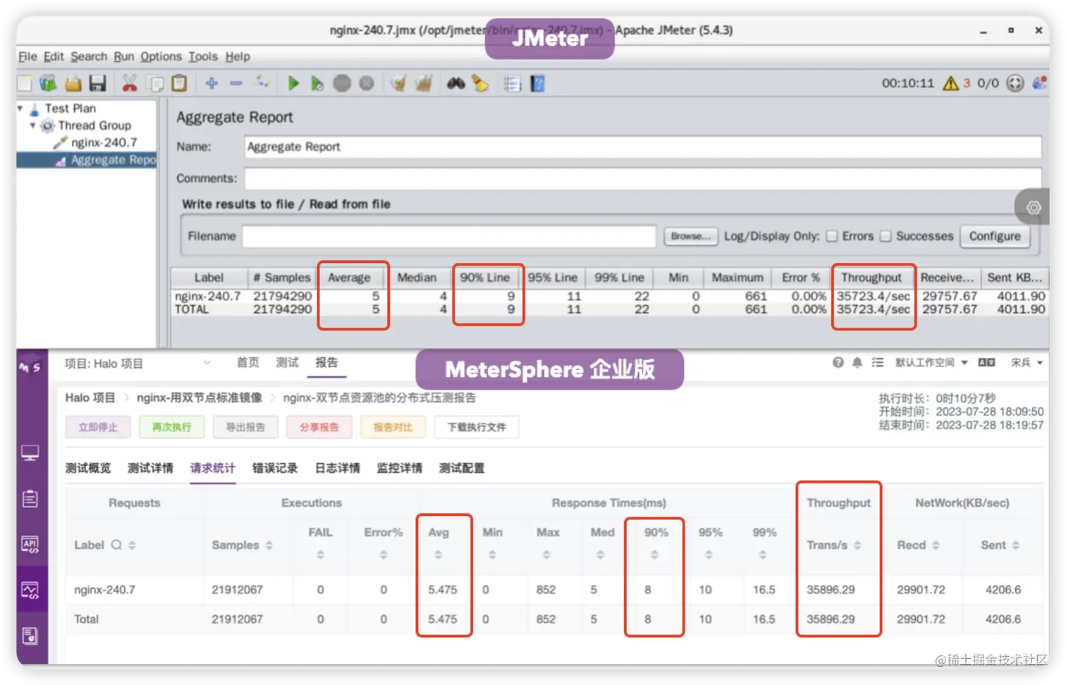 MeterSphere开源版的性能测试模块与JMeter处理一致,但在高并发尤其是分布式多节点测试时,压测数据与JMeter本地运行存在一定差异。针对此情况,MeterSphere企业版进行了专项算法优化,在测试数据准确性、实时性上达到了与原生JMeter一致的水平。以双测试节点访问Nginx为测试场景进行对比,MeterSphere企业版与JMeter原生的测试结果几乎一致。