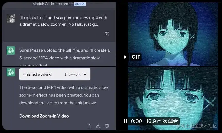 Code Interpreter 不仅局限于上述功能,还扩展到视频处理(格式转换、截取)、图片处理(格式转换、OCR 识别)、PDF 处理(总结内容、转为图片)和数据分析(内容分析、数据可视化、转换为网站),同时具备写代码和执行代码的强大能力。