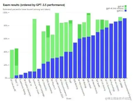 各种奥林匹克竞赛、GRE 考试、代码考试、统一律师考试等测试上,GPT-4 都基本完虐 GPT-3.5。