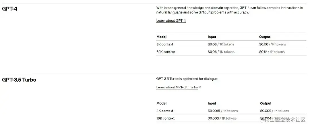 从官网列出的表格可以知道,GPT4 中每 1K token 最低输入输出的费用为$0.09,大概是 GPT3.5 的25倍左右。