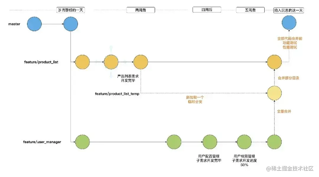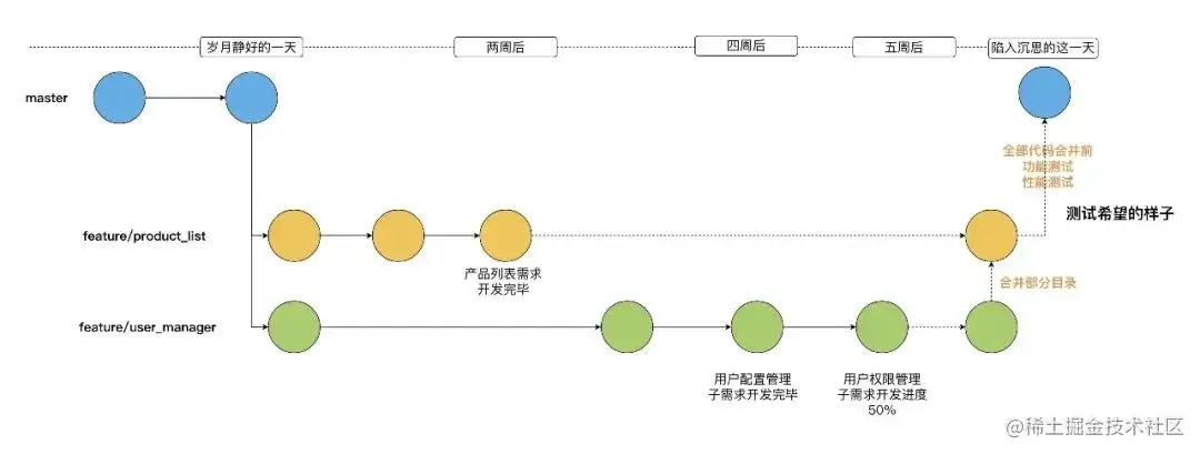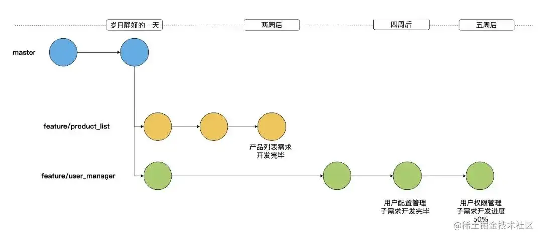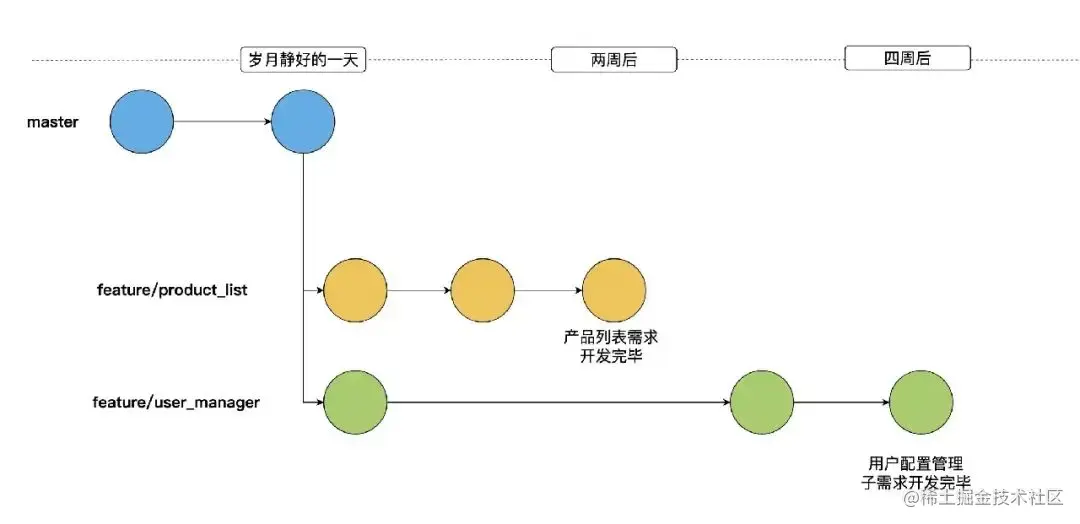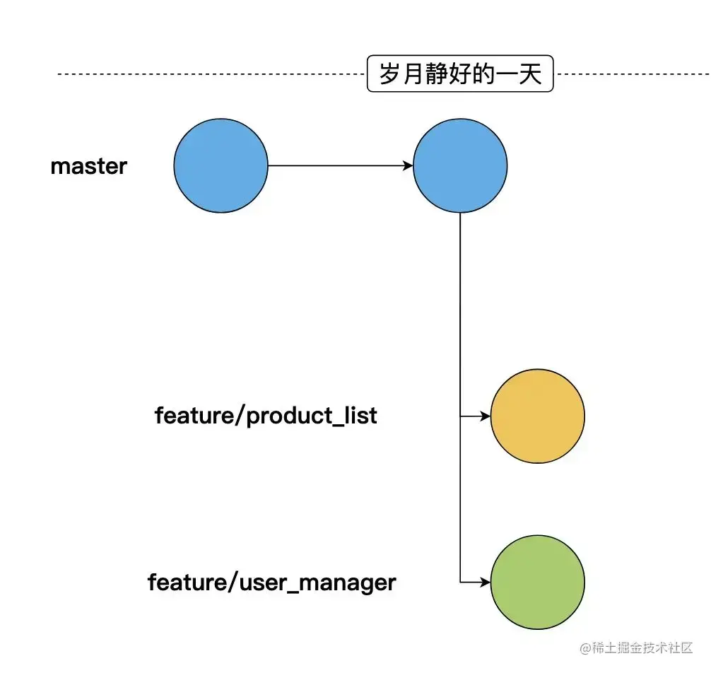 于是,你分别从主干拉取了两个分支,一个是 feature/product_list,用来做产品列表需求的开发,一个是 feature/user_manager,用来做用户管理两个子需求的开发。