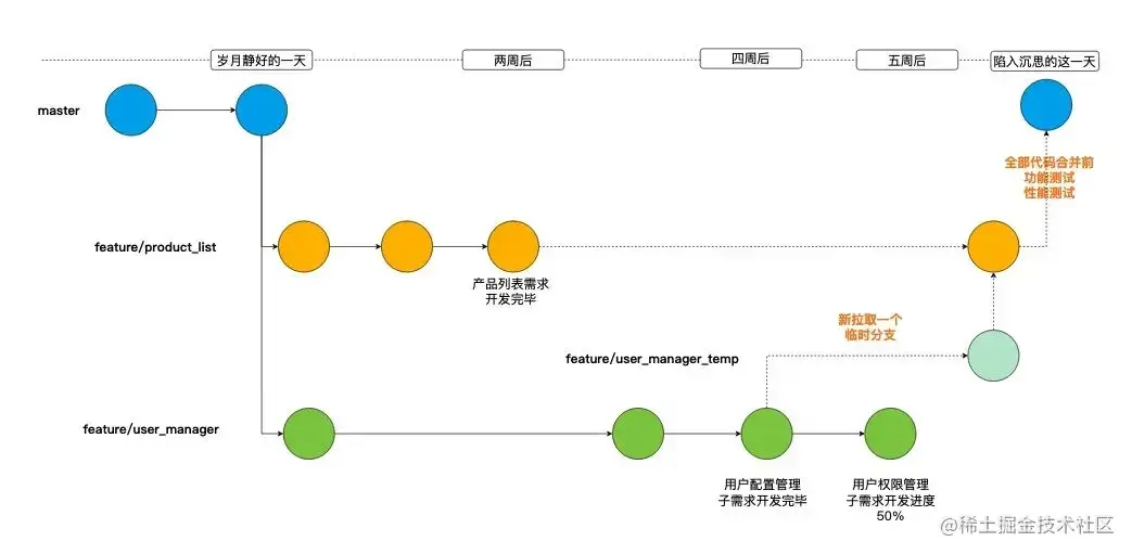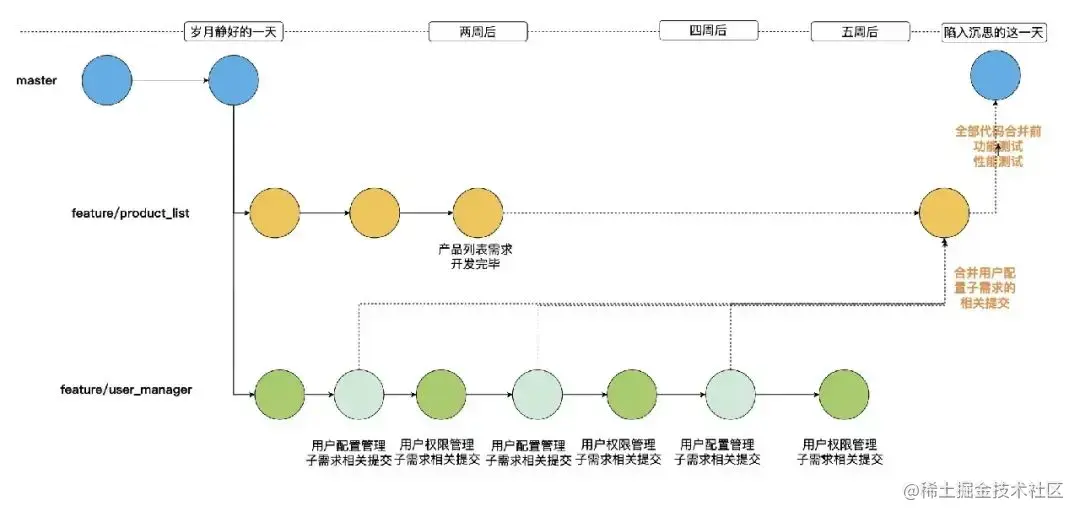 然后切分支到 feature/user_manager 转而进行用户管理需求的开发工作,这个开发工作大概用时一个月,两个子需求各两周的开发周期。