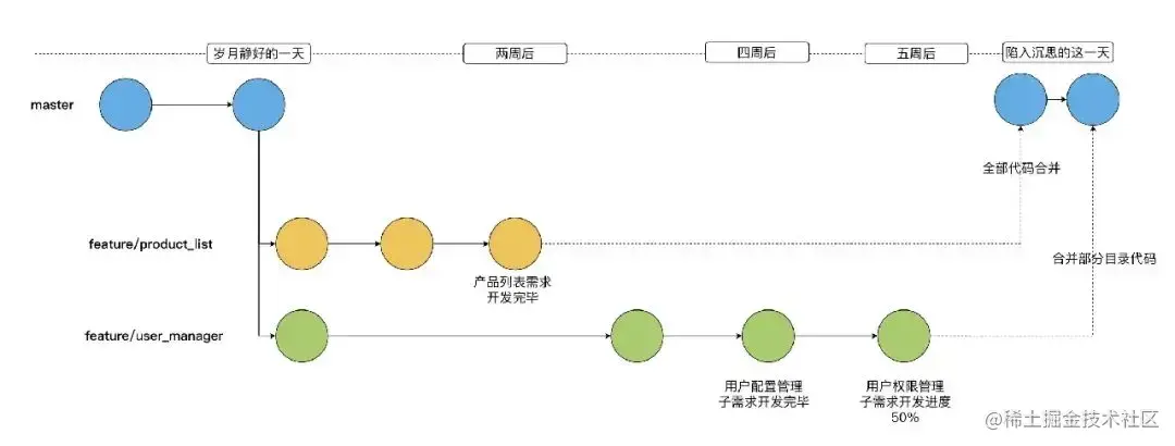 这时,你想到了,可以发起两次向主干的合入,一次是将 feature/product_list 分支合入 master,一次是将 feature/user_manager 的部分目录合入 master。