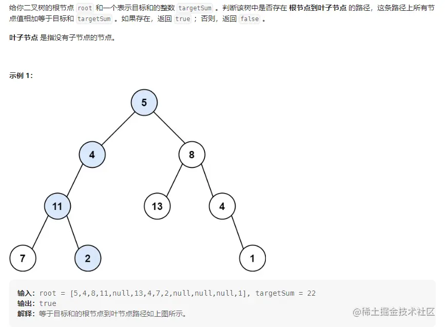 // 这里判断的意识是,如果这个传入的路径总和和减去处理叶节点的中和 和 叶节点的 val 相等的话,那么就是 ok 的