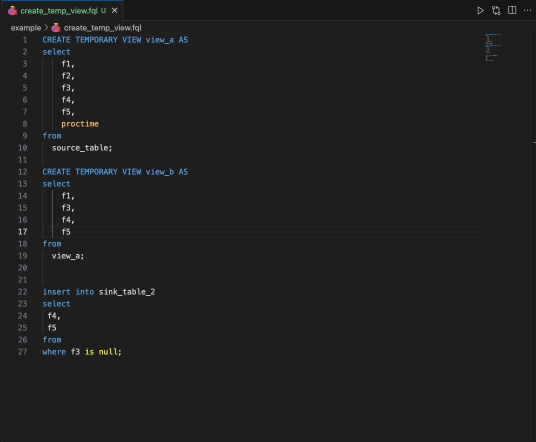 基于上述情况,我阅读了IDEA和VS Code的开发者文档,考虑到实现工作量,先开发了一款名为Flink SQL Helper的VS Code插件,希望这款插件能够让开发者们高效、专注地完成FlinkSQL的开发。地址:marketplace.visualstudio.com/items?itemN…。下面我们一起来看一下这个插件结合VS Code实现的相关功能。