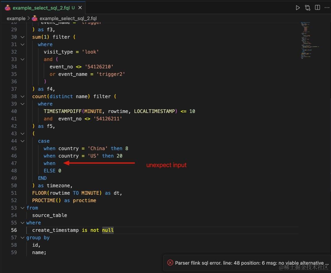 错误提示是个很重要的功能,让错误尽早地被发现可以有效提升开发效率——举个例子,当我们的Flink SQL比较长时,拉起来就要耗一些时间,等startup的时候错误才会报出来。如果错误有好几个,那么每次startup只会检查出一个,通过这样的方式来排错特别耗时。在这个插件中,写完Flink SQL只要保存一下,插件就会做一次语法检测,如果有问题就会在右下方提示。