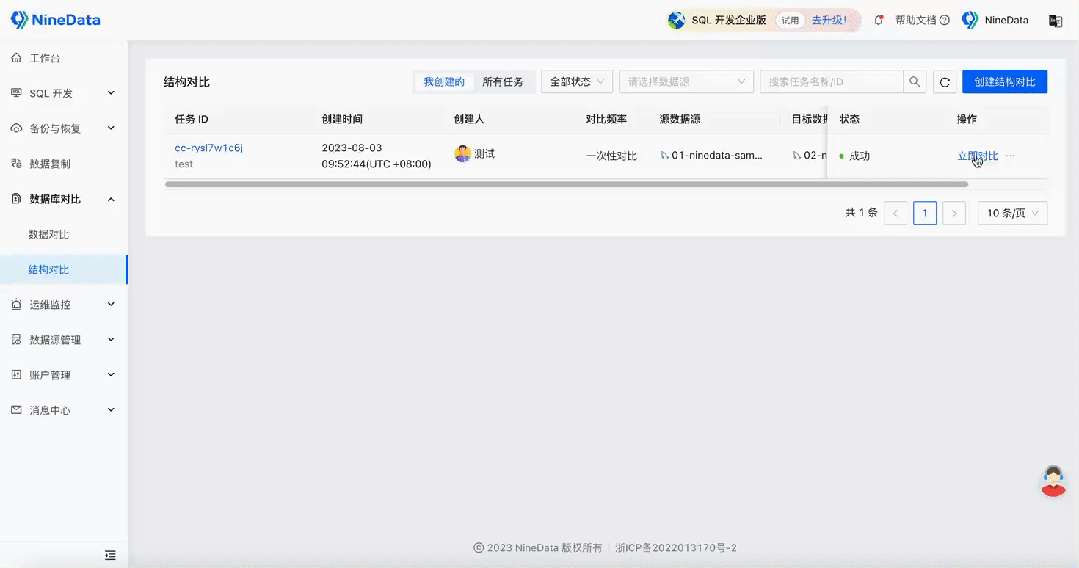 - 免费使用: 与售价高昂的商业化工具相比,NineData 的结构对比、数据对比功能可免费使用,适用于不同规模的企业和个人。
