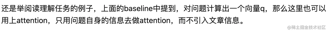 - 同上面例子,就是对问题的词进行向量化,然后每个词与其他词计算attention,并不引入文章的信息,也可以单独用文章信息(同上的个人理解)