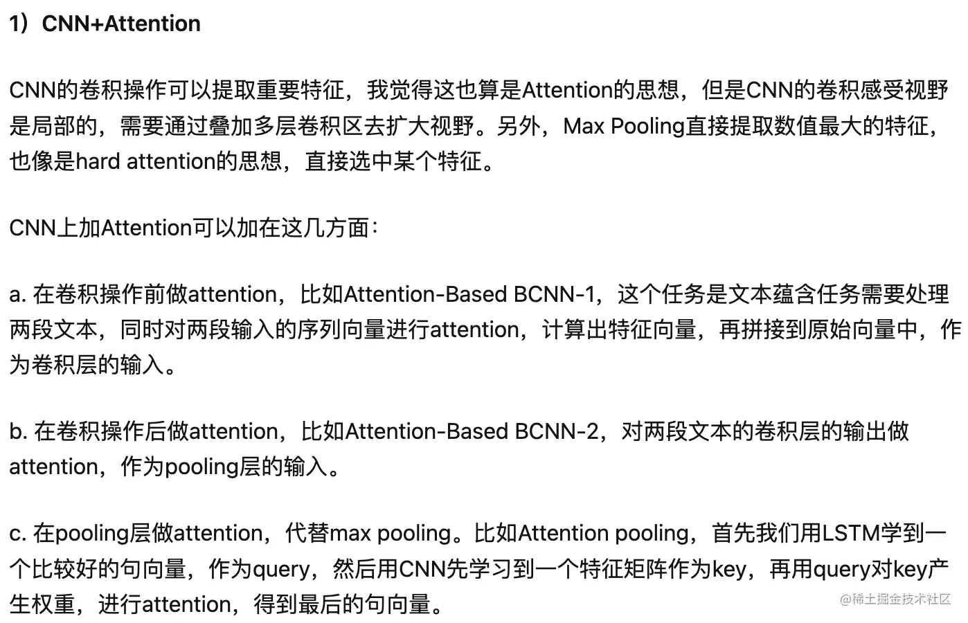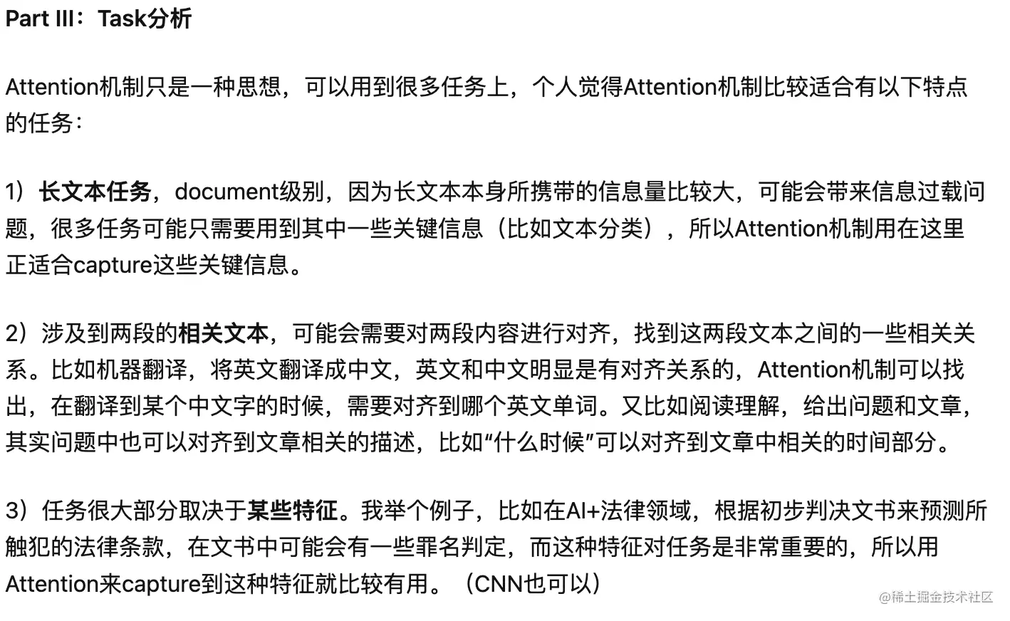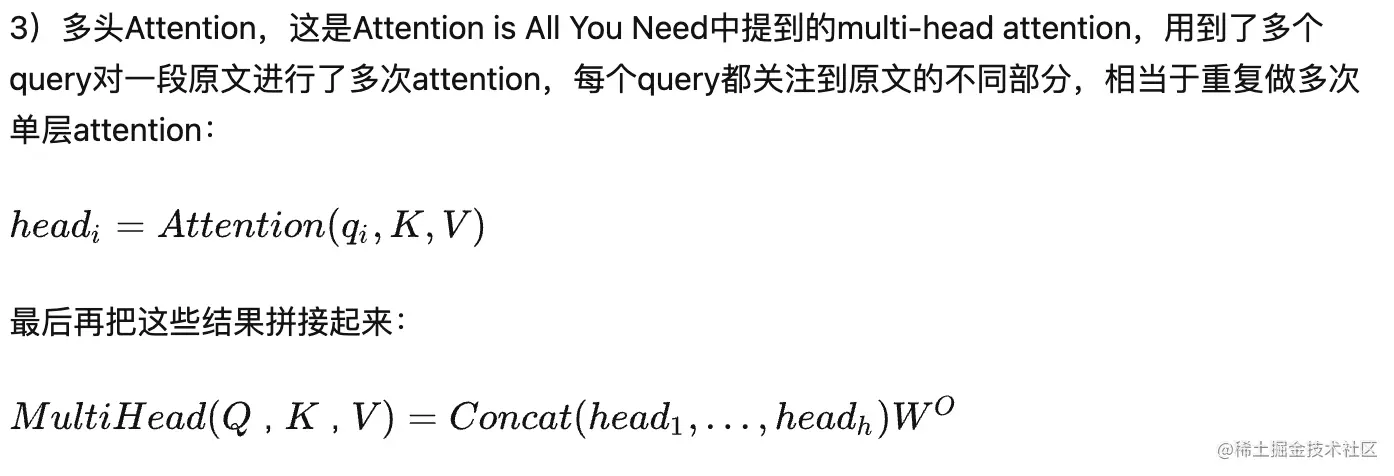 - 多层Attention,一般用于文本具有层次关系的模型,假设我们把一个document划分成多个句子,在第一层,我们分别对每个句子使用attention计算出一个句向量(也就是单层attention);在第二层,我们对所有句向量再做attention计算出一个文档向量(也是一个单层attention),最后再用这个文档向量去做任务(个人感觉可能gpt的回答)。