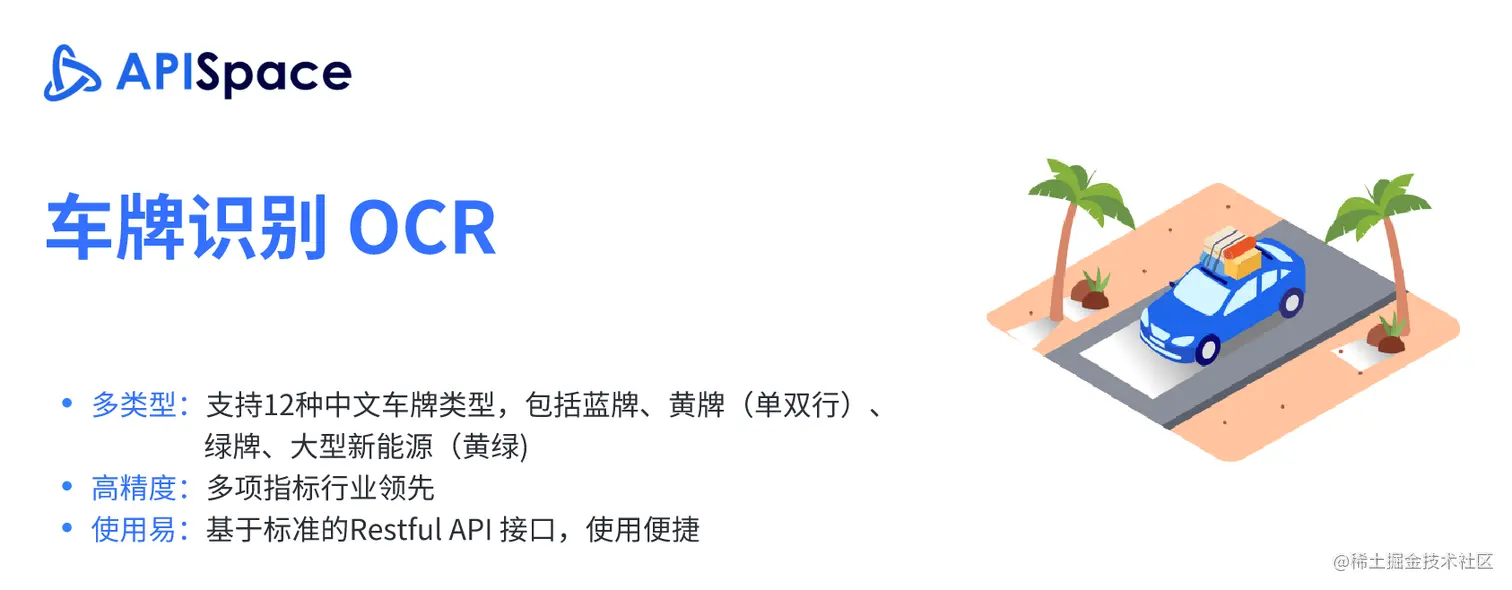 APISpace 的车牌识别OCR API,支持12种中文车牌类型,如蓝牌、黄牌(单双行)、绿牌、大型新能源(黄绿),并能同时识别图像中的多张车牌。