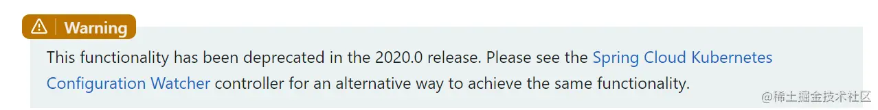 就是该功能在2020.0版本之后,该功能已经被弃用了,改为使用Spring Cloud Kubernates Configuration Watcher。如果大家项目的k8s版本是 >= 1.9,使用Reloader来做配置热更新也是一个不错选择,对这个组件感兴趣的朋友可以查看官网