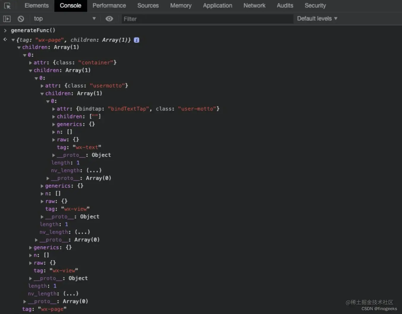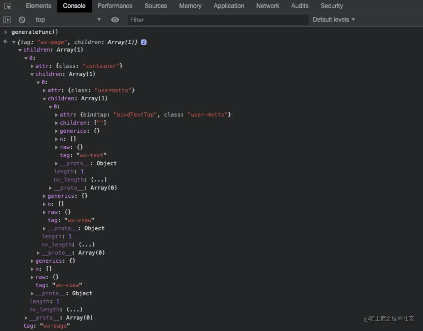 可以看到上面找到声明事件标记的层级中,attr 属性内部有 bindtap: bindTextTap 键值对。那么这个 DOM 结构是怎么进行事件解析的呢?