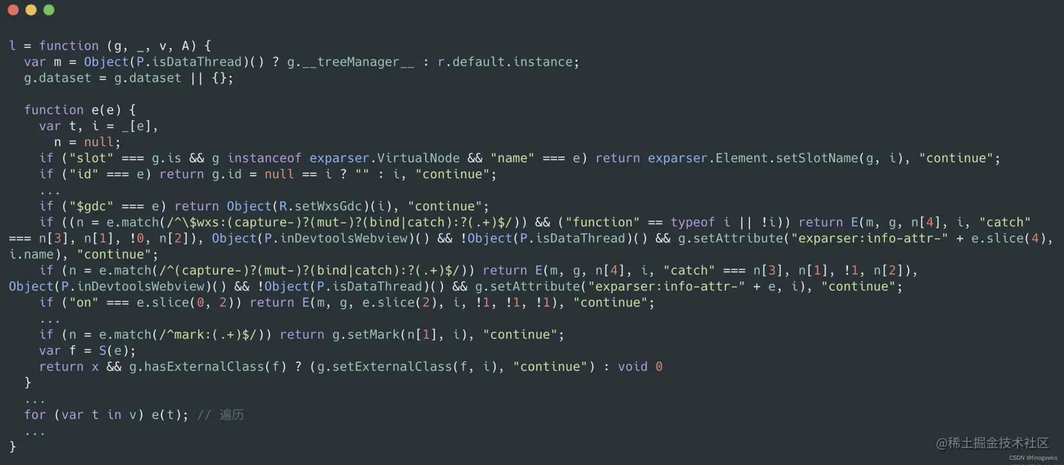 e函数中有很多的if,是用来判断特殊的属性名称的,我们绑定的tap事件键值对是 bindtap: bindTextTap , key 也就是 bindtap ,事件绑定的前缀有很多比如 bind、catch,看到第10行左右的if中用正则if (n = e.match(/^(capture-)?(mut-)?(bind|catch):?(.+)$/)) 判断 attr 中的属性名是否为事件属性。如果是事件属性的话执行E函数,并且转换为 exparser 组件系统中的 attr 属性名称 exparser:info-attr- 。