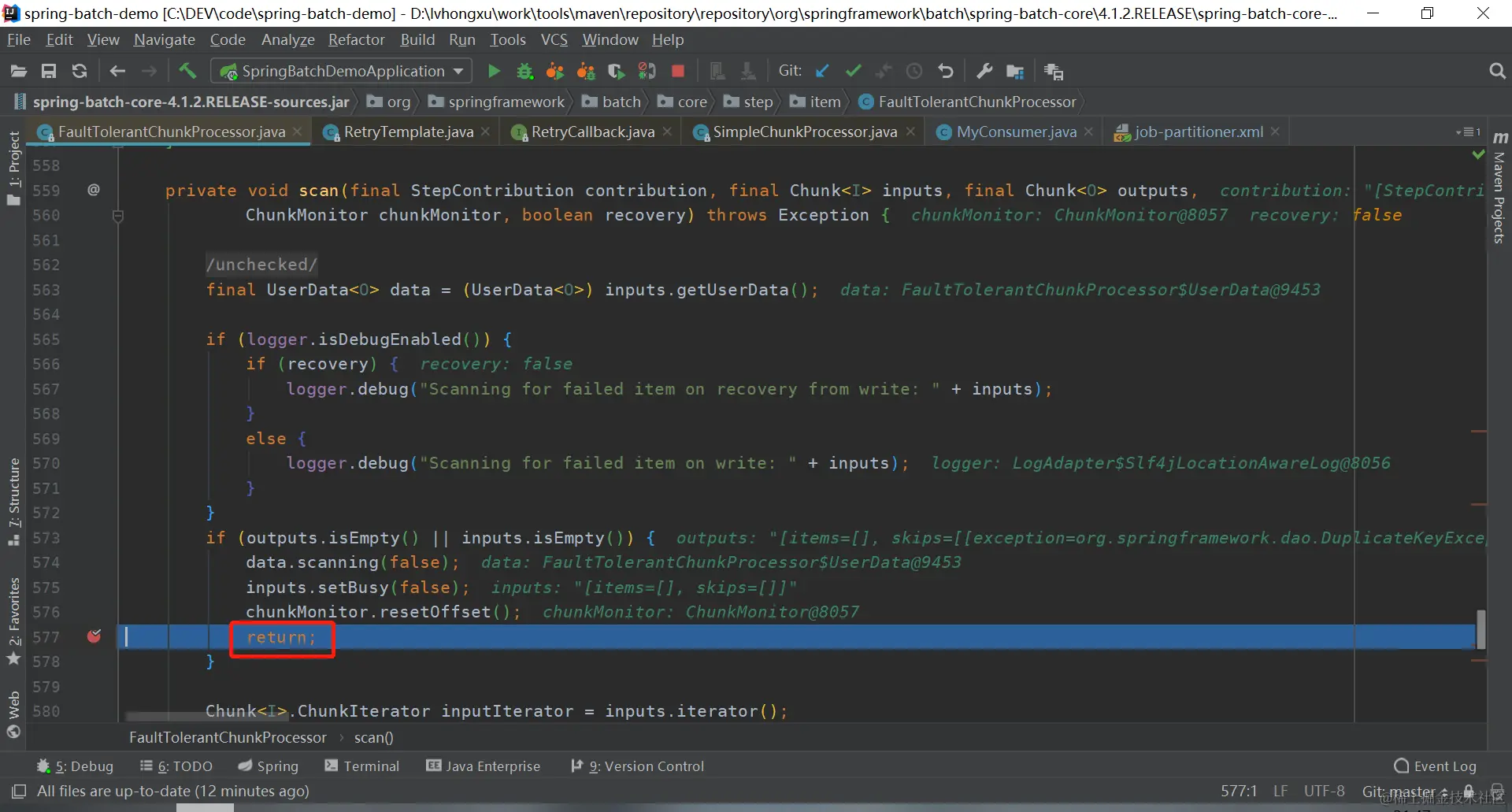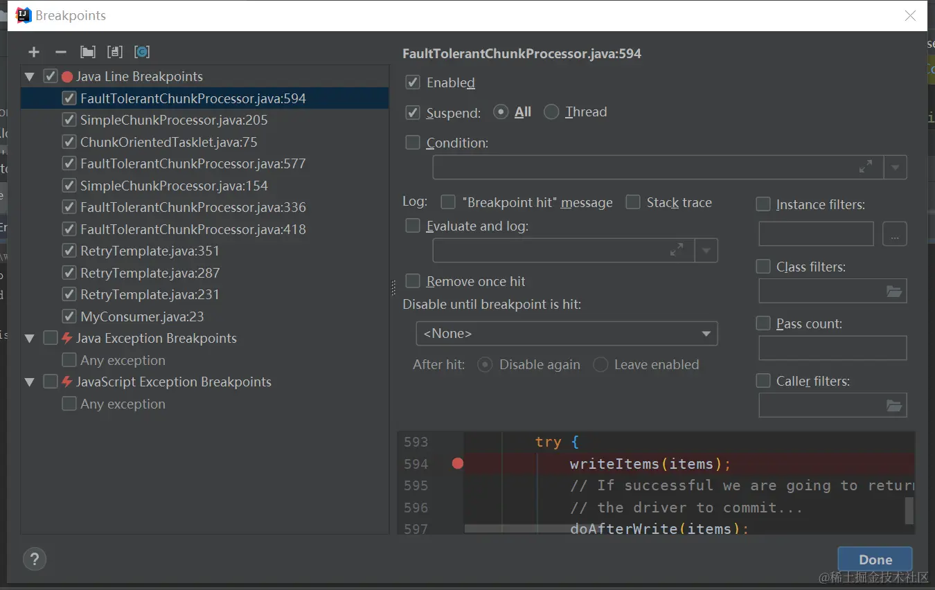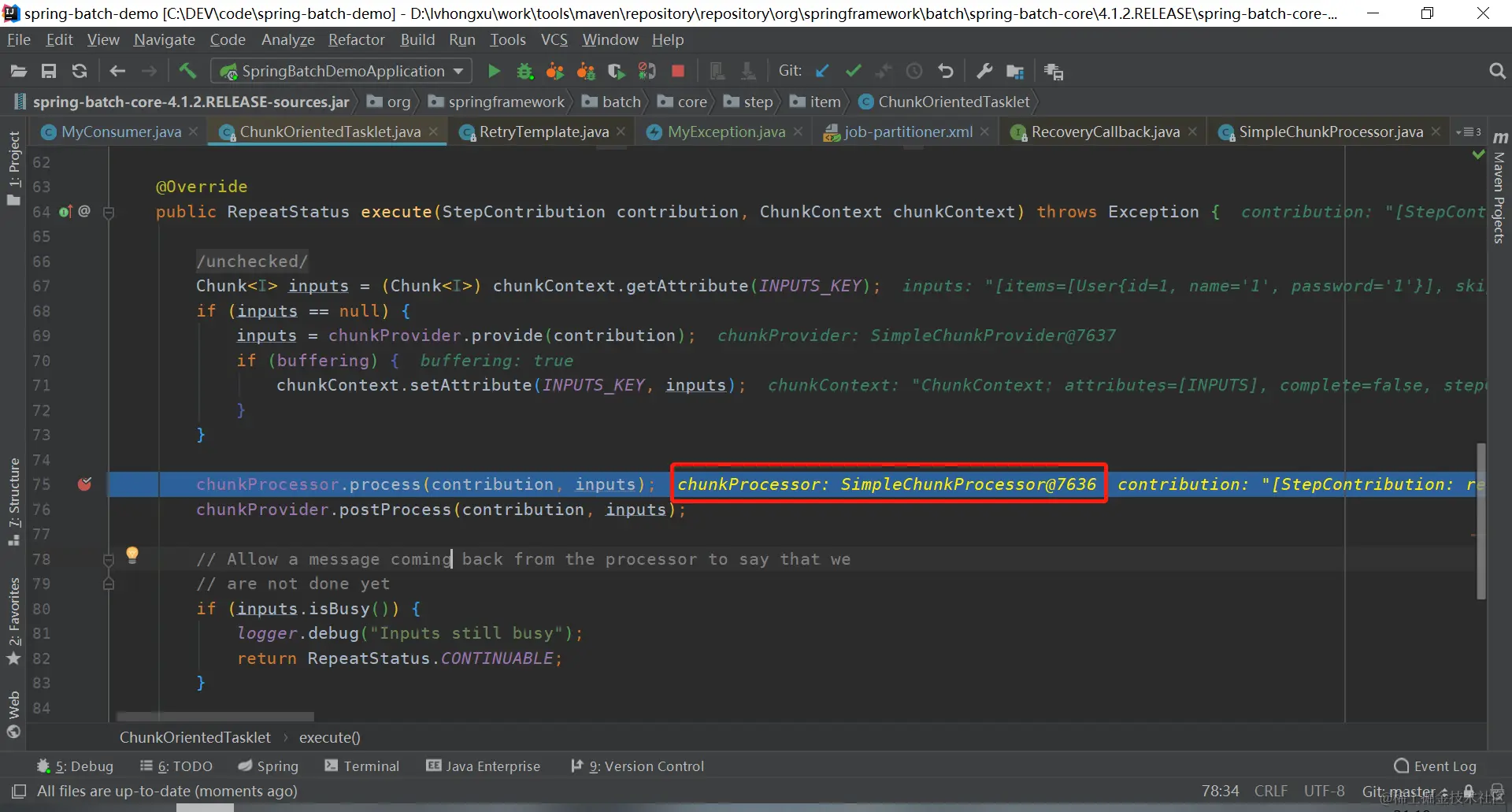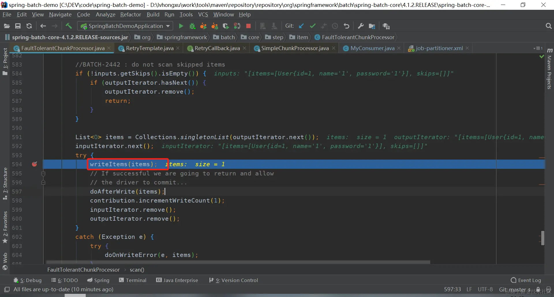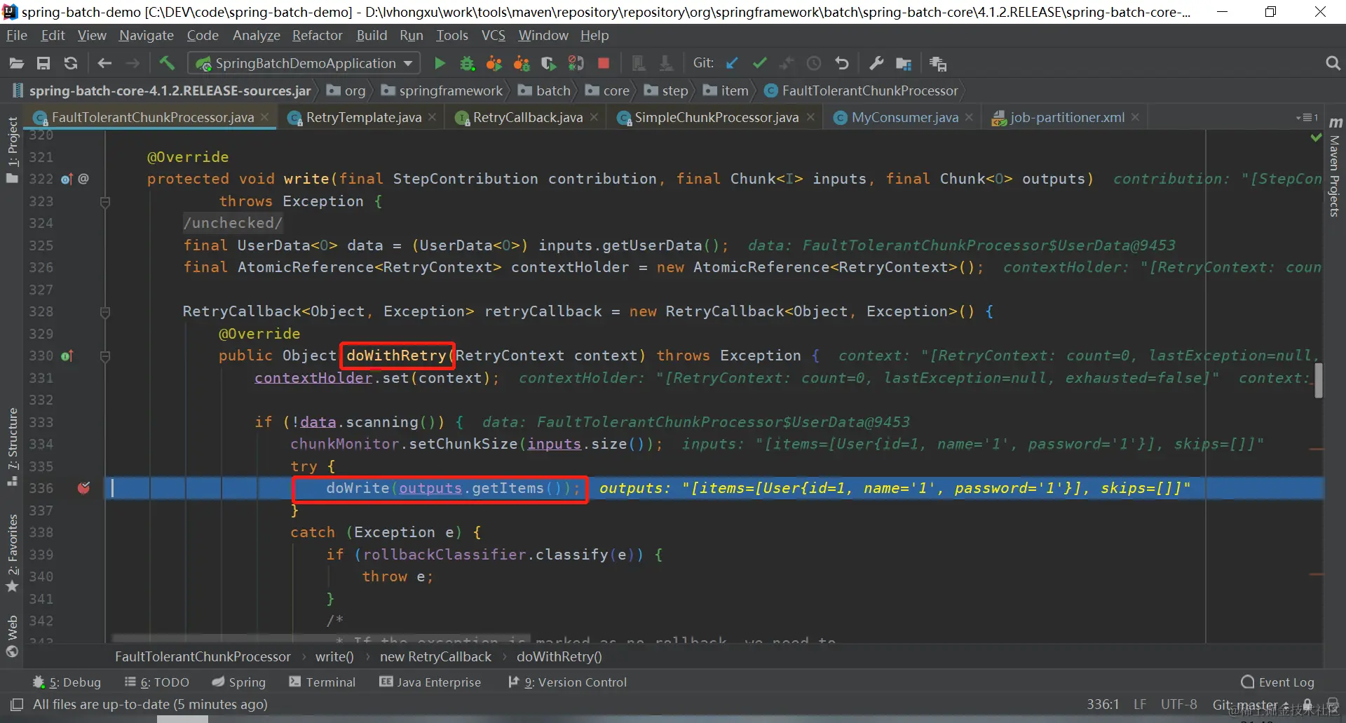 当第一次消费数据时,走的是**return retryCallback.doWithRetry(context);**这行,这行代码调用的是FaultTolerantChunkProcessor类的write方法中retryCallback的doWithRetry方法,其中dowriter方法之后调用的就是我们consumer的consumeData方法