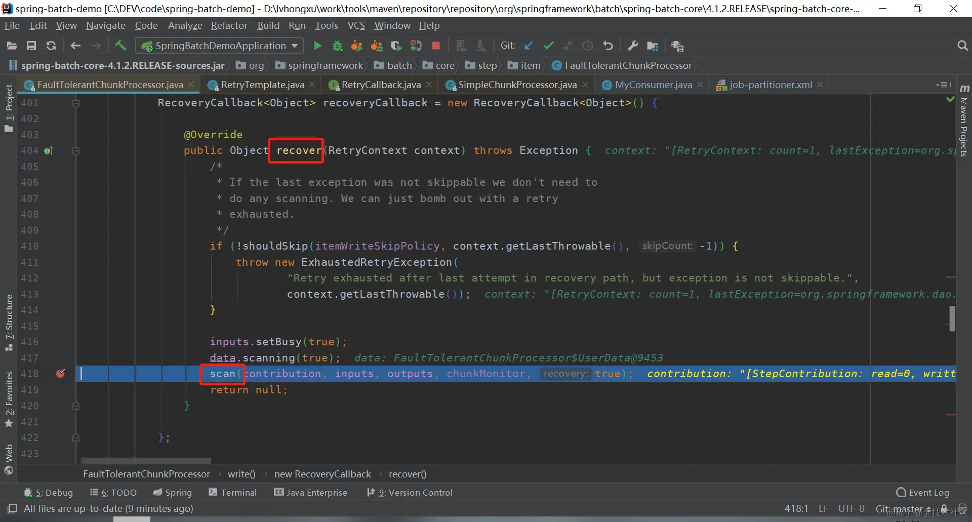 在第一次调用后会抛出异常,但是错误被catch住了,所以会在RetryTemplate.doExecute方法中继续往下走,走的是return handleRetryExhausted(recoveryCallback, context, state);这行,这个调用的就是FaultTolerantChunkProcessor类的write方法中recoveryCallback的recover方法
