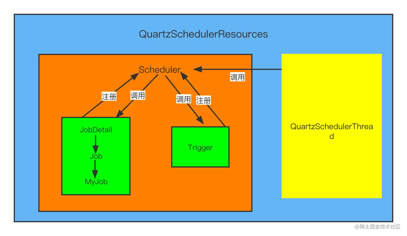 这里一共完成两个逻辑:加载配置和生成scheduler,接下来进入核心方法instantiate(),这里面逻辑很多,其核心操作就是初始化各种调度所需要的对象,比如线程池、JobStore等等,最后把上面创建的对象放到 QuartzSchedulerResources 中并把线程池起来,这个相当于 QuartzScheduler 的资源存放处, 方法相关代码如下: