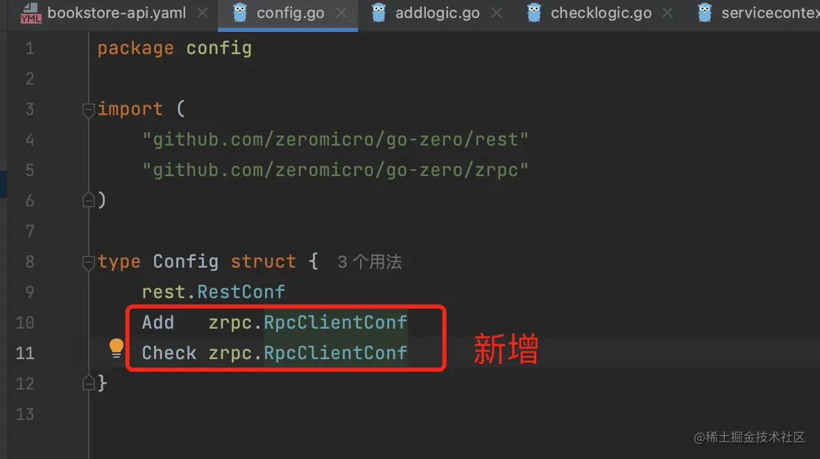 修改api/internal/config/config.go如下,增加add&check服务依赖