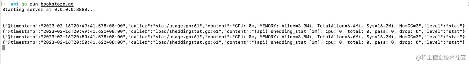 {"@timestamp":"2023-02-16T16:31:15.044+08:00","caller":"stat/metrics.go:210","content":"(bookstore-api) - qps: 0.0/s, drops: 0, avg time: 0.0ms, med: 0.0ms, 90th: 0.0ms, 99th: 0.0ms, 99.9th: 0.0ms","level":"stat"}