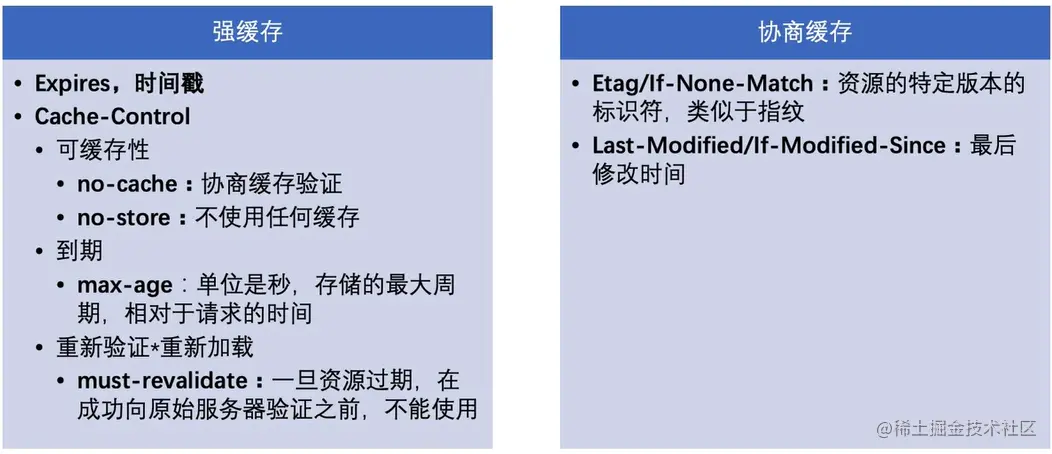 - 协商缓存:当强制缓存失效时,客户端会通过向服务器发送请求来检查资源是否存在更新,如果服务器资源没有变化,则返回304 Not Modified状态码,客户端就会使用本地的缓存副本。常见的缓存控制方式有:Last-Modified/If-Modified-Since和ETag/If-None-Match。